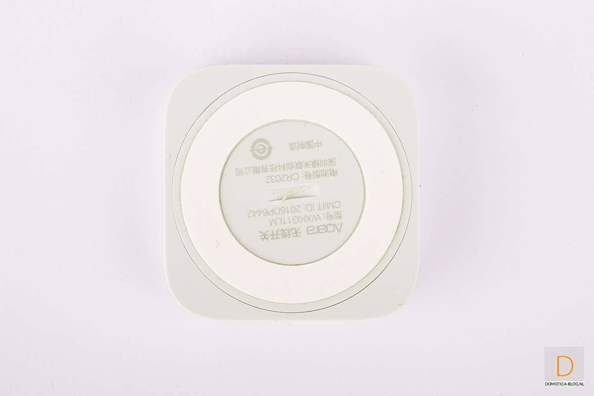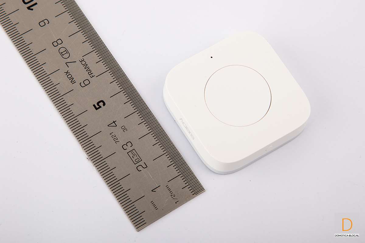 Hij is wit vankleur en 45x45x12mm groot en aan de bovenkant zit een knop. Aan de zijkant zit ook een knopje om hem toe te voegen aan de controller. Later meer hierover. Er zit ook nog een LEDje aan de bovenkant welke gebruikt wordt voor het toevoegen. Helaas zie je geen status na een klik op de knop. Dit is jammer omdat dit toch nog even een extra bevestiging geeft dat je de knop hebt ingedrukt.