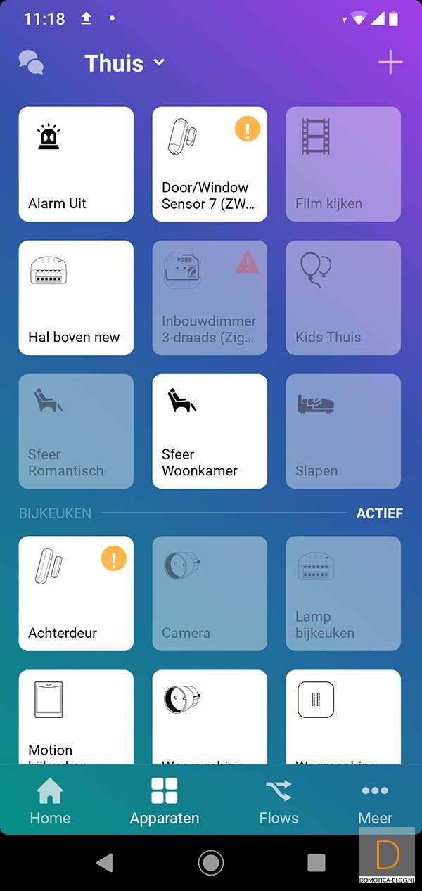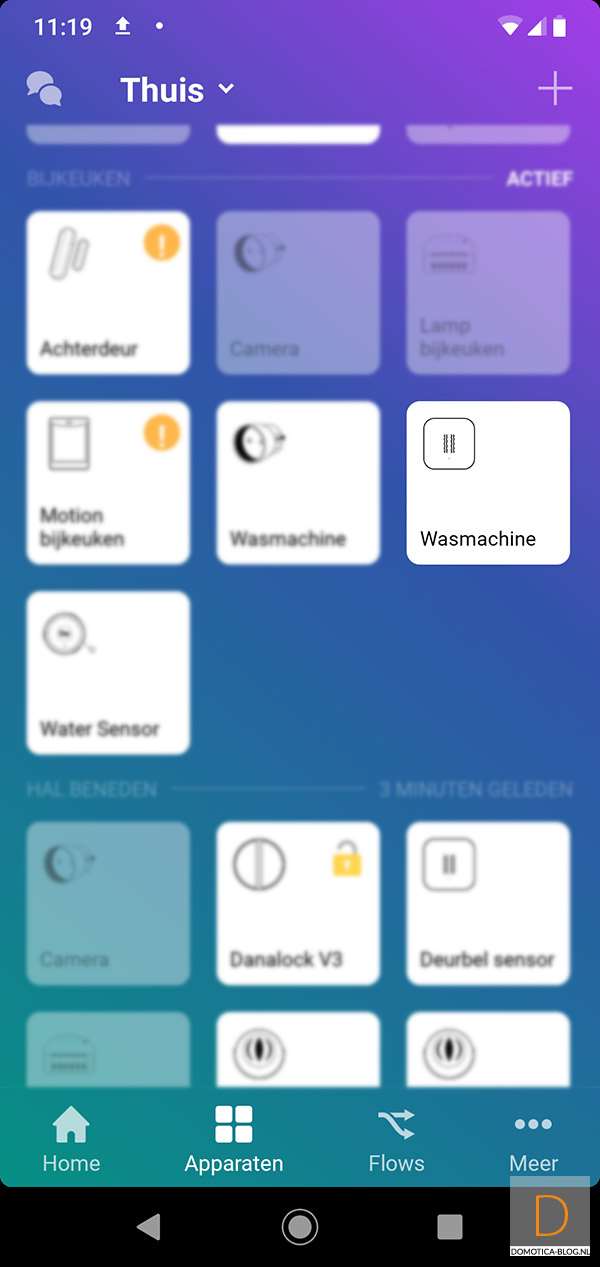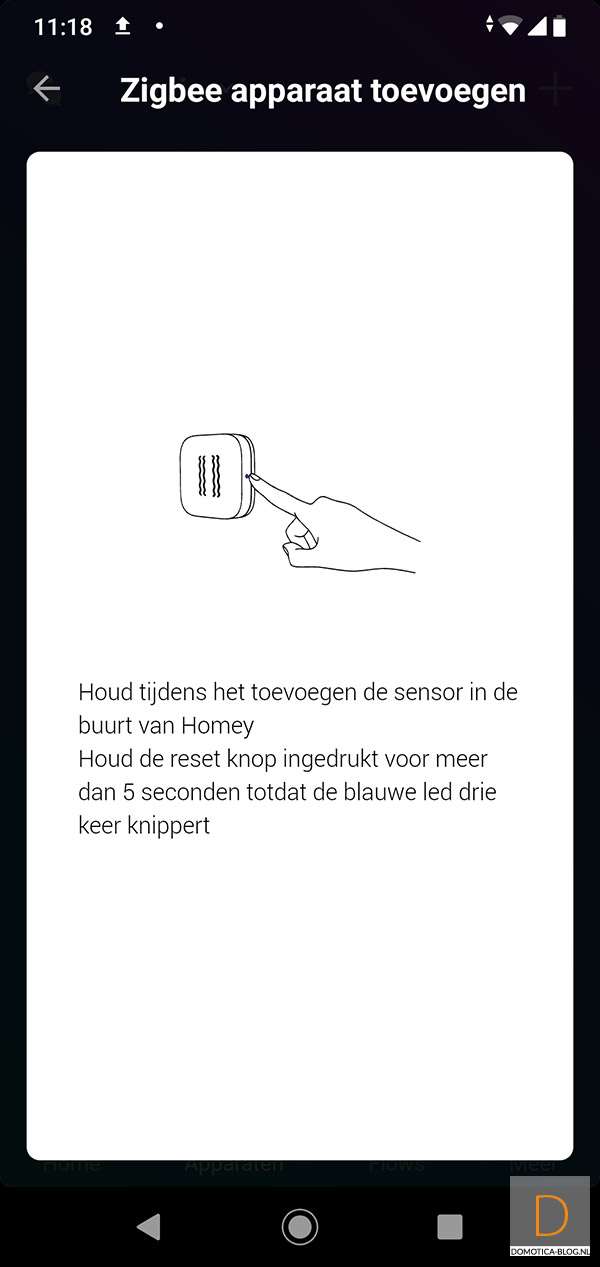 Om het toevoegen te starten druk je 5 seconden lang het knopje aan de onderkant in. De LED zal blauw gaan knipperen. Blijf vervolgens om de 2 seconden op het knopje drukken om te zorgen dat de sensor wakker blijft. Blijf dit doen tot hij door de Homey helemaal is toegevoegd. Ik zie de sensor verschijnen en het open/sluiten van de deur wordt geregistreerd. Het enige wat ontbreekt is de batterij status. Zorg er trouwens voor dat je de sensor dicht bij de Homey houdt. Ik heb gemerkt dat het toevoegen moeizaam gaat als je hem te ver weg houdt.
