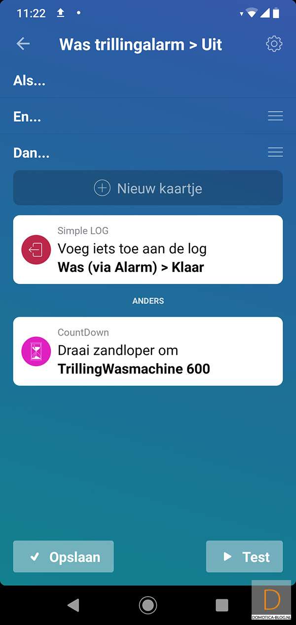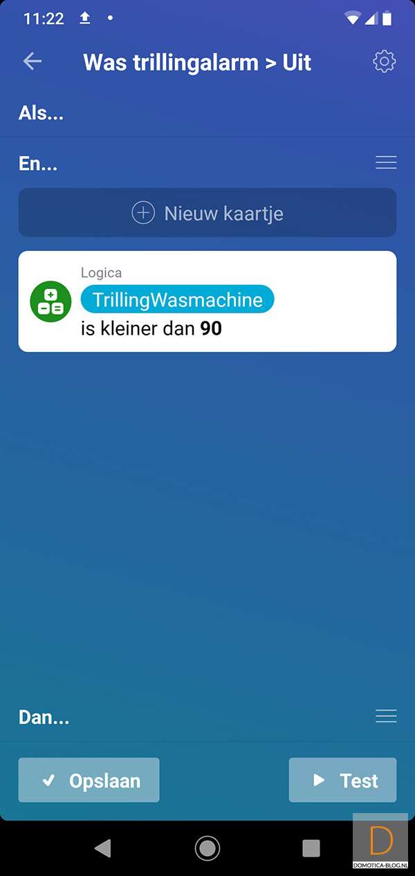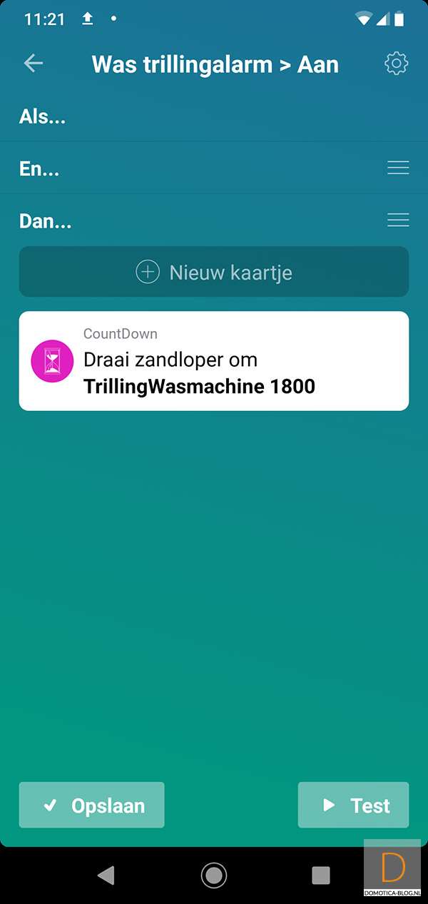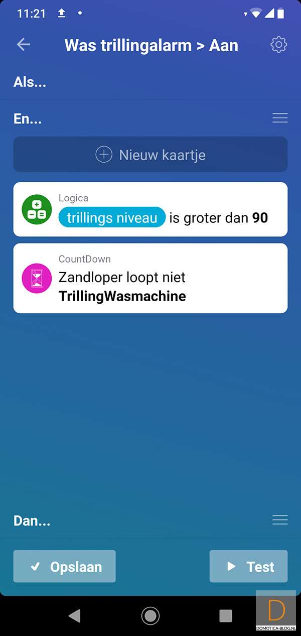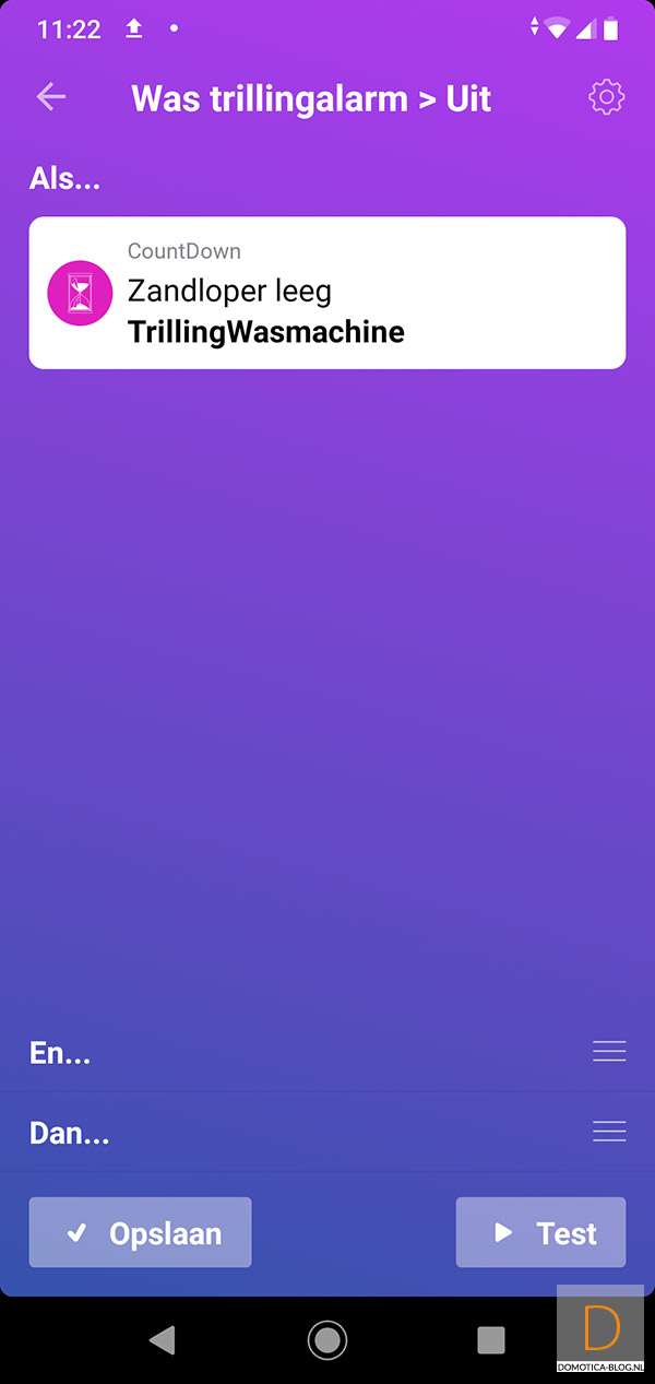 Terug naar het bepalen of de wasmachine aanstaat. Ik ben er achter gekomen dat hij altijd boven de 90 trilling komt en dan binnen 30 min. klaar is. Ik gebruik deze waarde dus om mijn flow te maken. Als eerst controleer ik of de trilling boven de 90 komt en de zandloper niet loopt (om te voorkomen dat hij meerdere keren start). Als dit het geval is zet ik een zandloper om (18000 sec.).