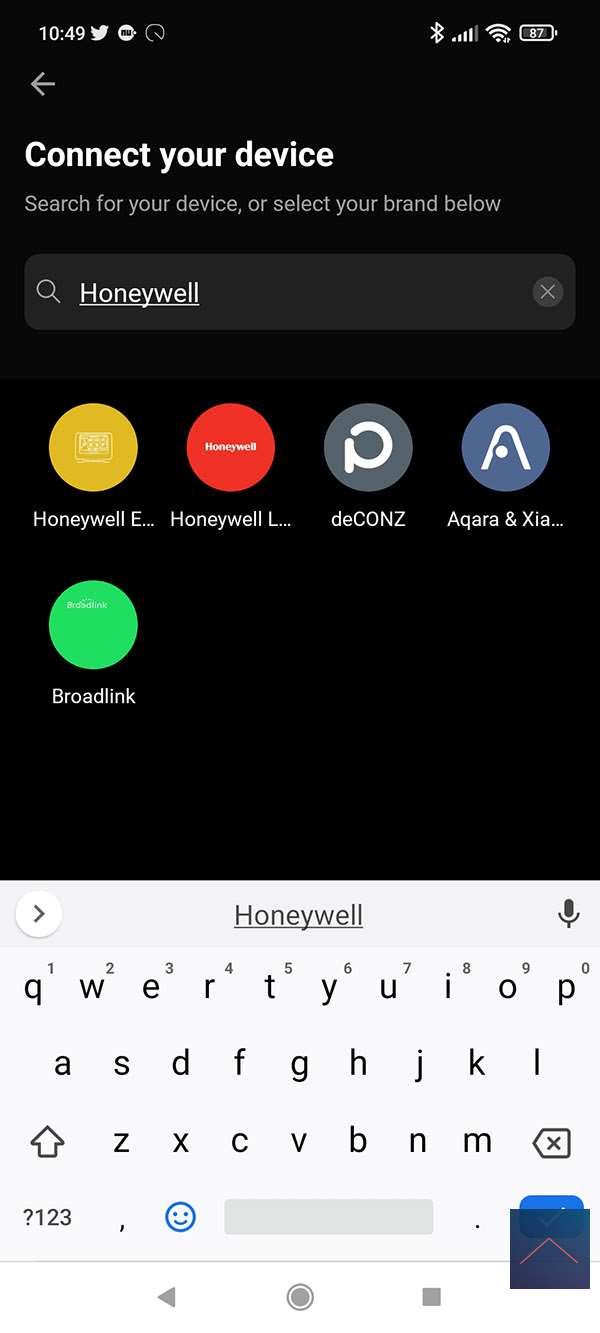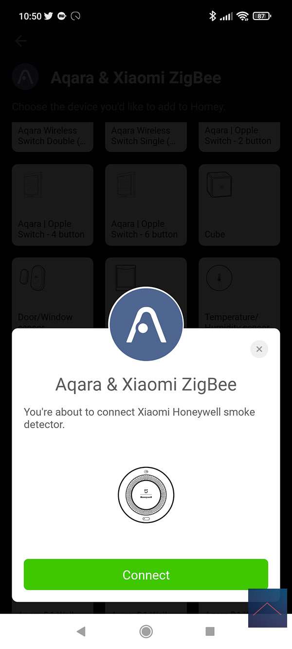 De eerst stap is om de batterij te plaatsen in de rookmelder. Hierna gaat hij een zelftest uitvoeren en zal hij wat piepjes geven. We laten dit even rustig zijn gang gaan voordat we hem toevoegen. Als hij is uitgepiept is starten we de Homey APP op en klikken we op het plusje en zoeken op Honeywell. Vervolgens moeten we de Aqara & Xiaomi APP selecteren. Hier valt hij namelijk onder.