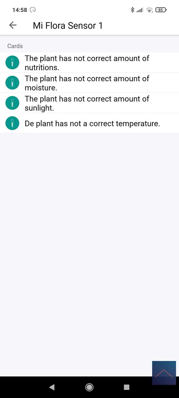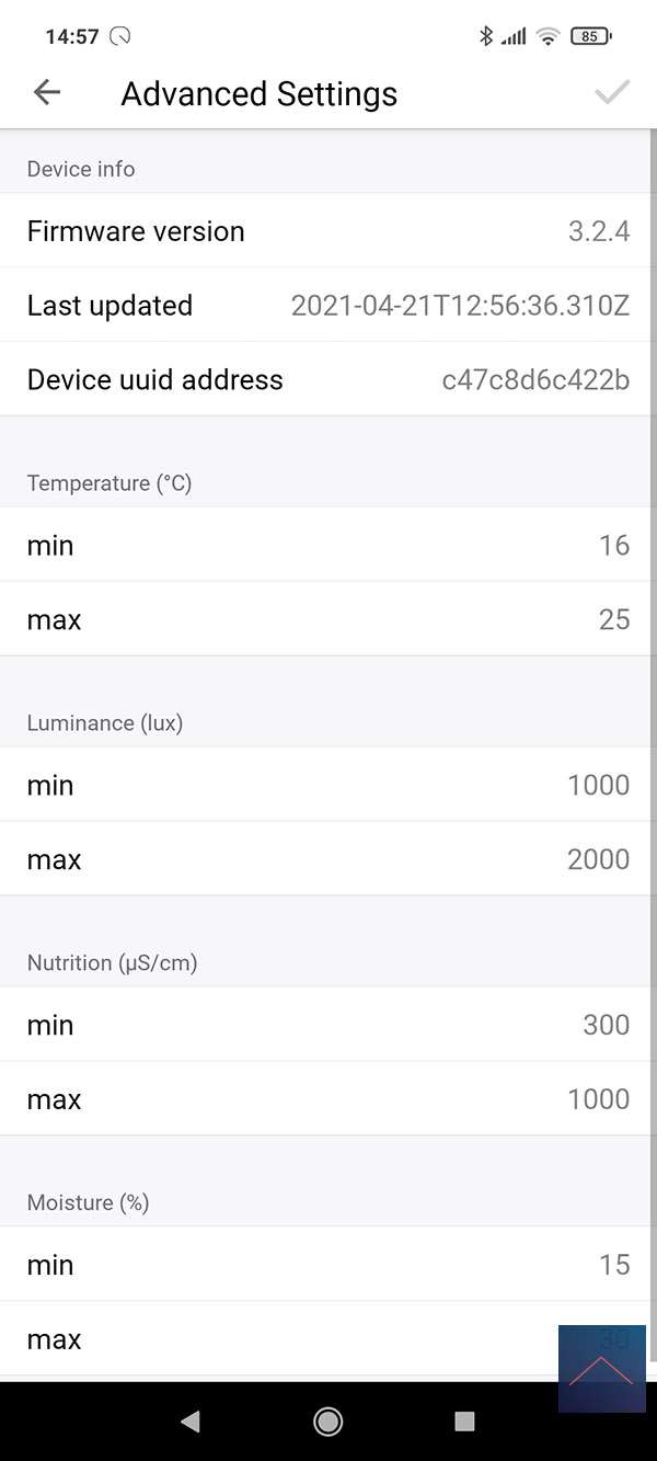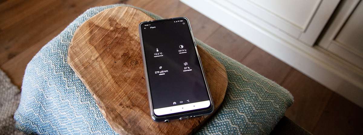 Je krijgt de luchtvochtigheid, voedingswaarde, hoeveelheid licht en de temperatuur te zien. Via de configuratie kun je de update interval veranderen van 15 min. (standaard) naar een andere waarde. Let wel op als je deze lager zet, zal de batterij ook sneller leeg gaan.