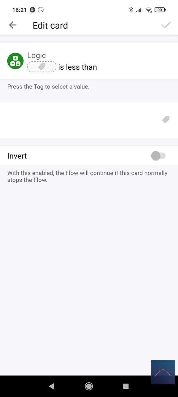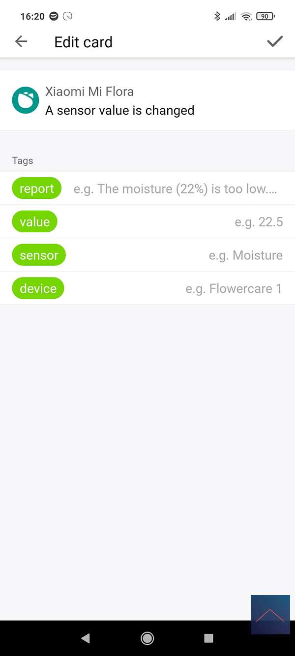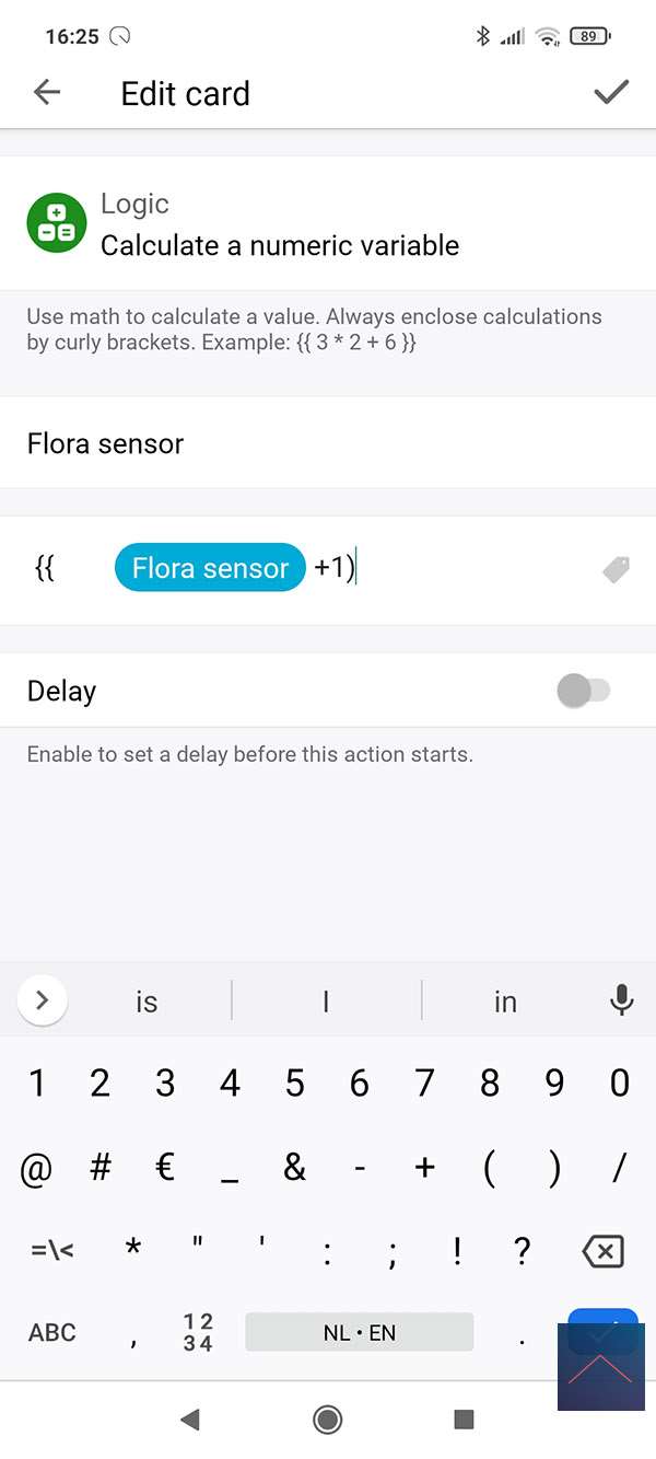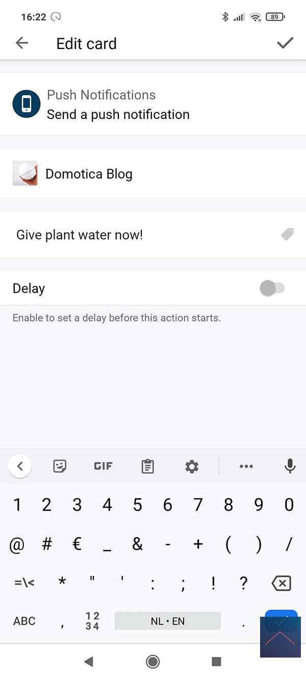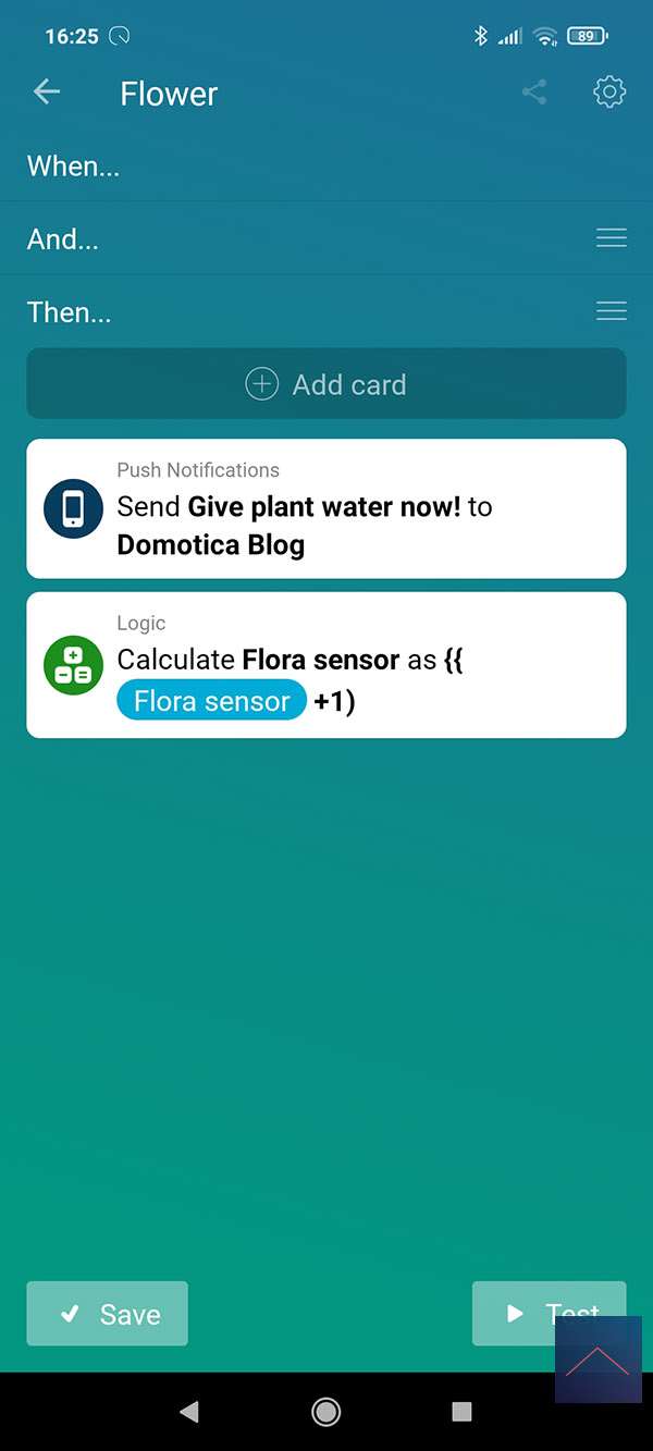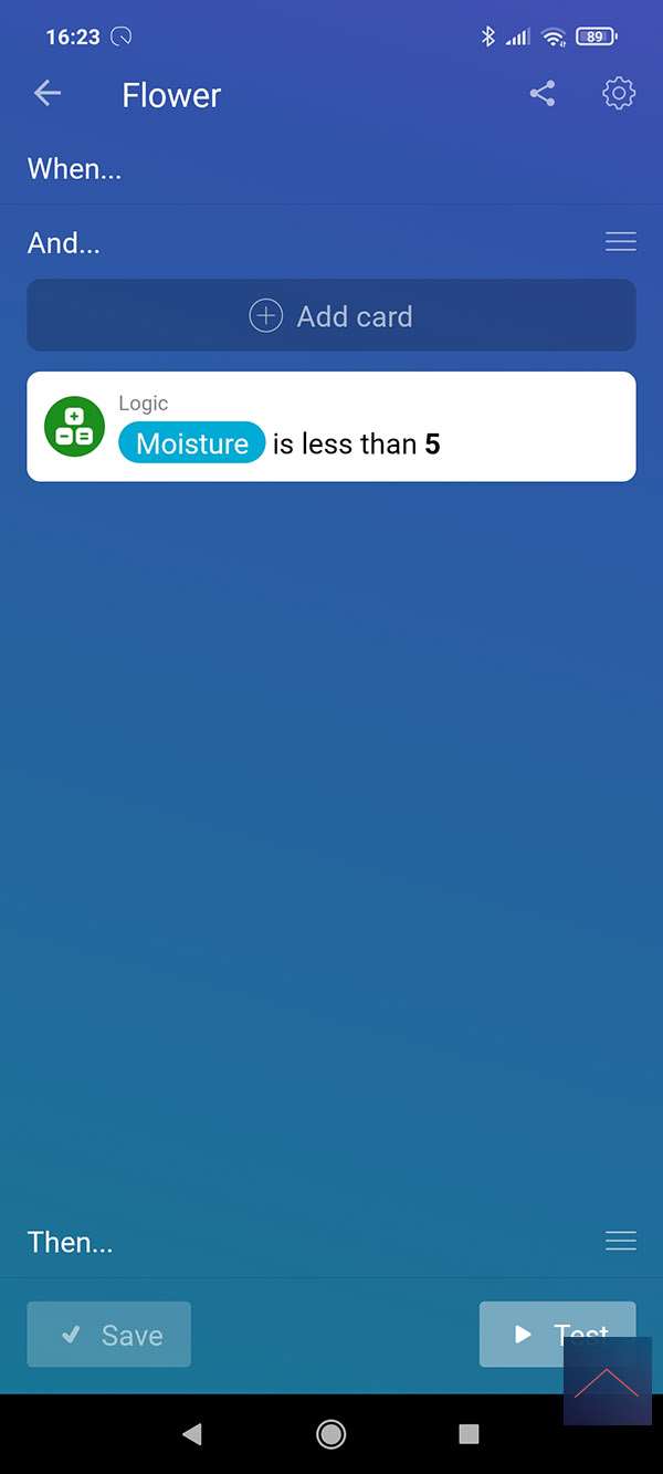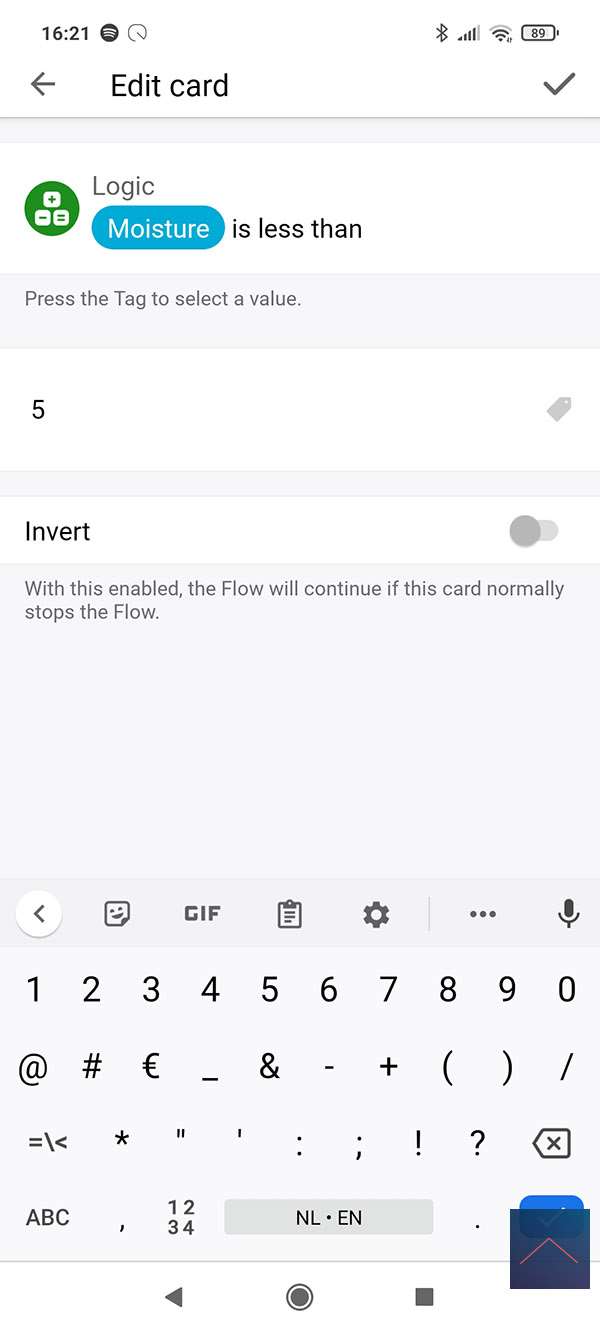 We beginnen bij de ALS met de "A sensor value is changed" en controleren bij de EN via een logic kaartje of de vochtwaarde lager is dan 5. Als dit het geval is sturen we een berichtje.