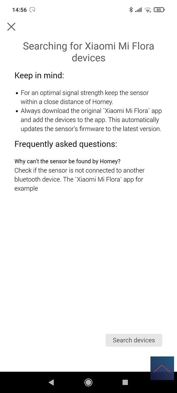 Zorg dat je niet te ver van de Homey af bent en druk op "search devices". Hij wordt bij mij direct gevonden en kan hem toevoegen. Ik zie direct waardes binnen komen maar een nieuwe update duurde vrij lang (40min.). Heb dus even geduld.