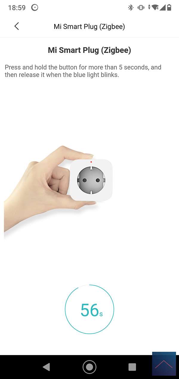 Na de scan wordt er gevraagd om de knop van de tussenstekker aan de bovenkant 5 seconde ingedrukt te houden. Het LEDtje aan de voorkant zal gaan knipperen. De gateway geeft ook een knippering en 2x een piep om aan te geven dat het gelukt is. En dit is ook het geval want ik zie hem in de APP te voorschijnen komen.