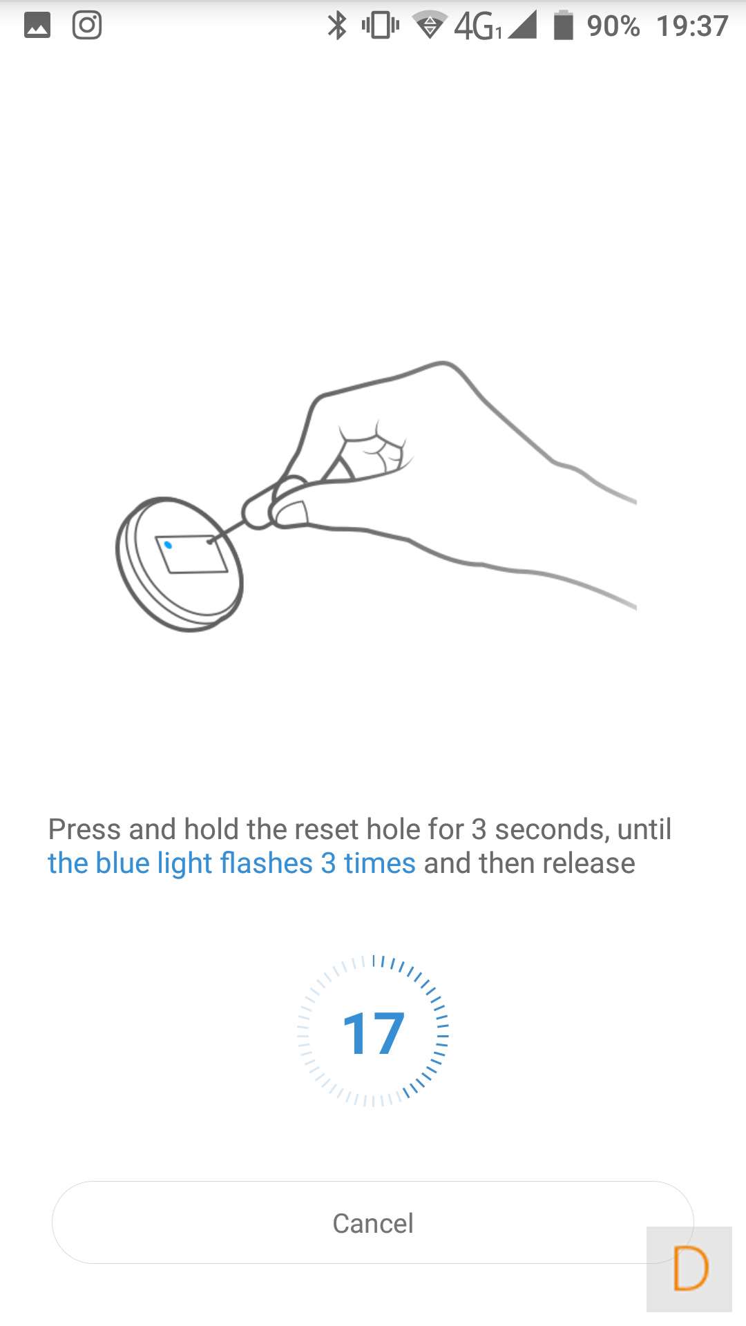 Om het toe voegen te starten druk je 3 seconden lang het gaatje aan de achterkant in. Let op dat je niet per ongeluk in het LEDje zit. Het LEDje gaat blauw knipperen als het toevoegen is gestart.
