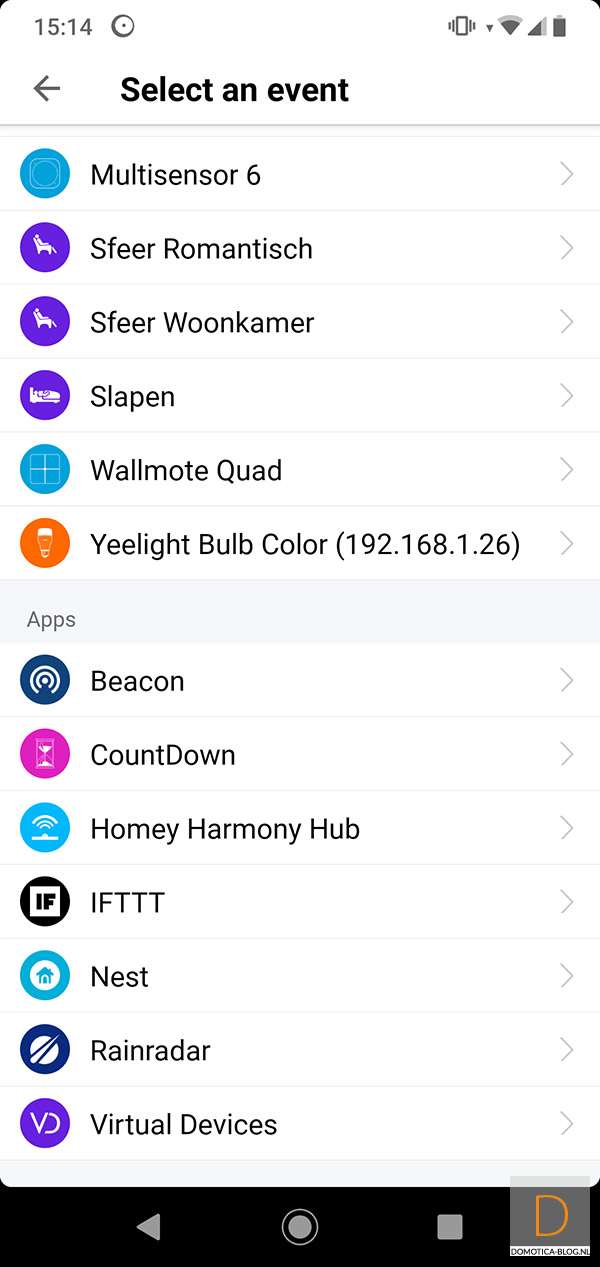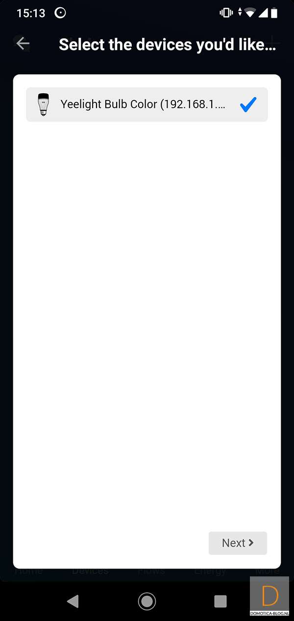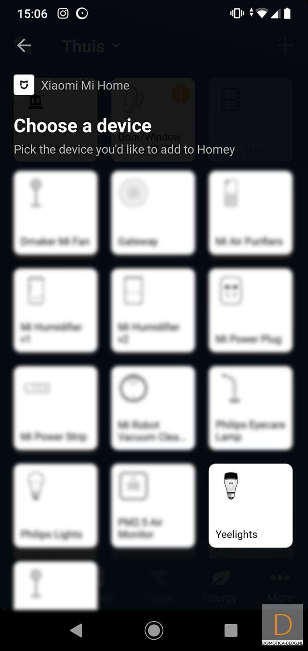 Als dit is gelukt start je de Homey APP op en klik op je apparaten en vervolgens op het plusje bovenin. Je zoekt daarna de Yeelight op. Vervolgens selecteer je de juiste lamp en hij zal toegevoegd worden.