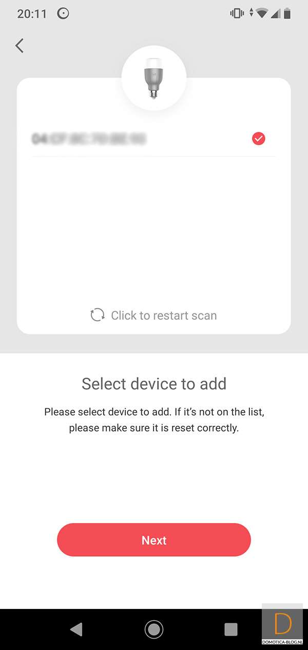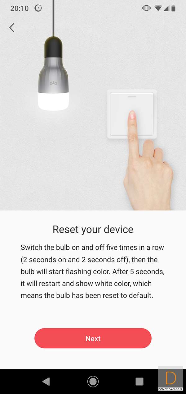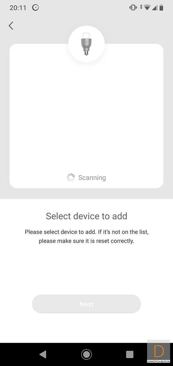 De volgende stap is natuurlijk het toevoegen van de lamp. Dit kun je doen door op het "add device" knopje te drukken en de LED (bulb) te selecteren. Hierna wordt aanbevolen om de lamp even te resetten. Dit kun je doen door 5x de lamp aan en uit te zetten. Hierna maakt je telefoon een rechtstreekse connectie met de lamp omdat deze een hotspot is. Als hij verbonden is dan stuurt hij jouw WiFi gegevens door naar de lamp. Zodat hij hierna gebruik maakt van jouw netwerk. Zorg dat je dichtbij de lamp in de buurt bent.