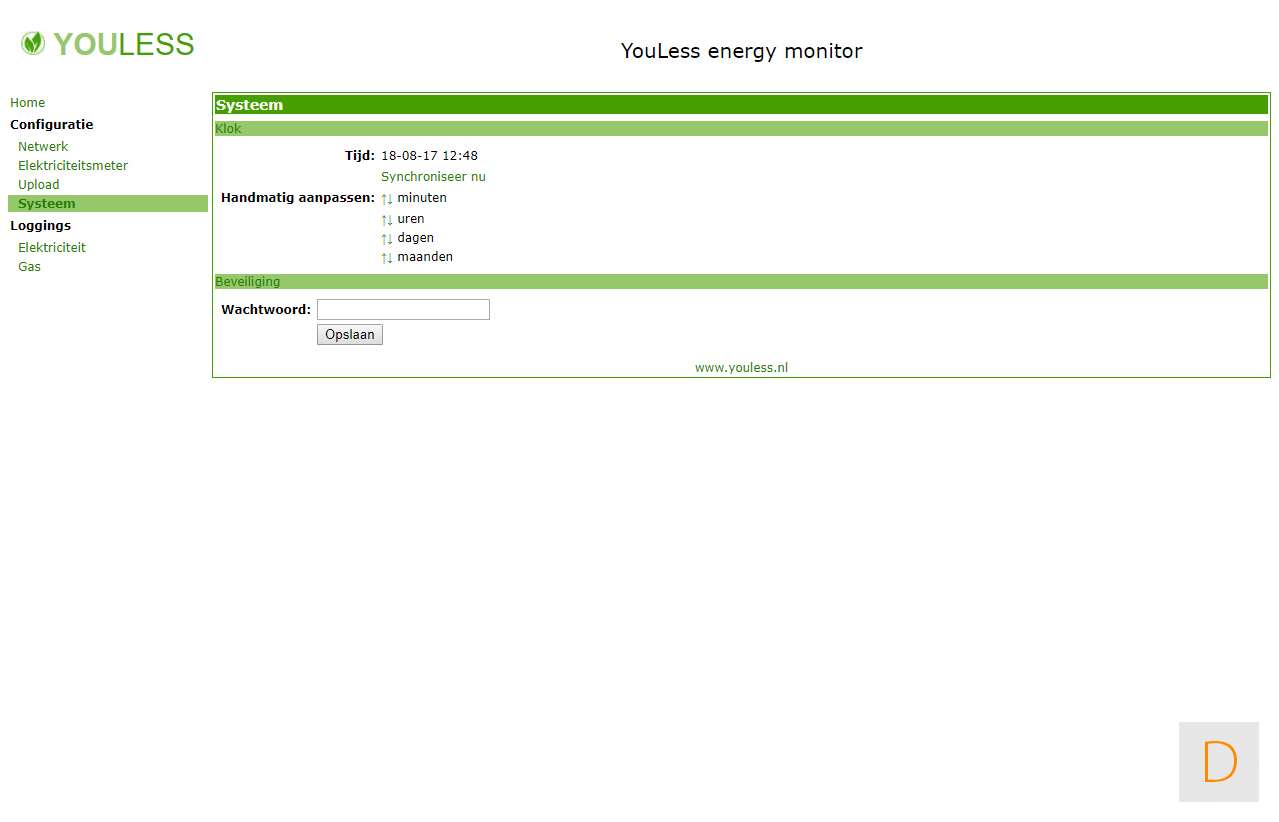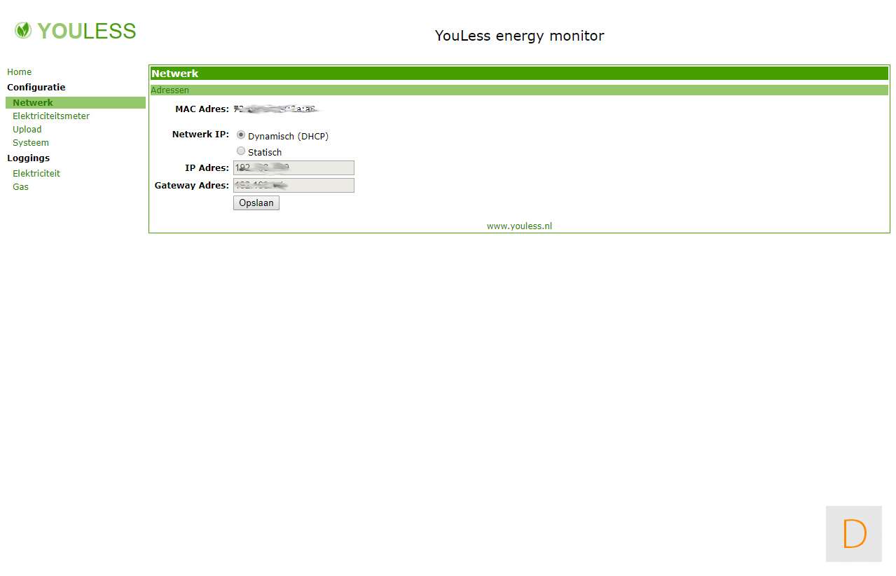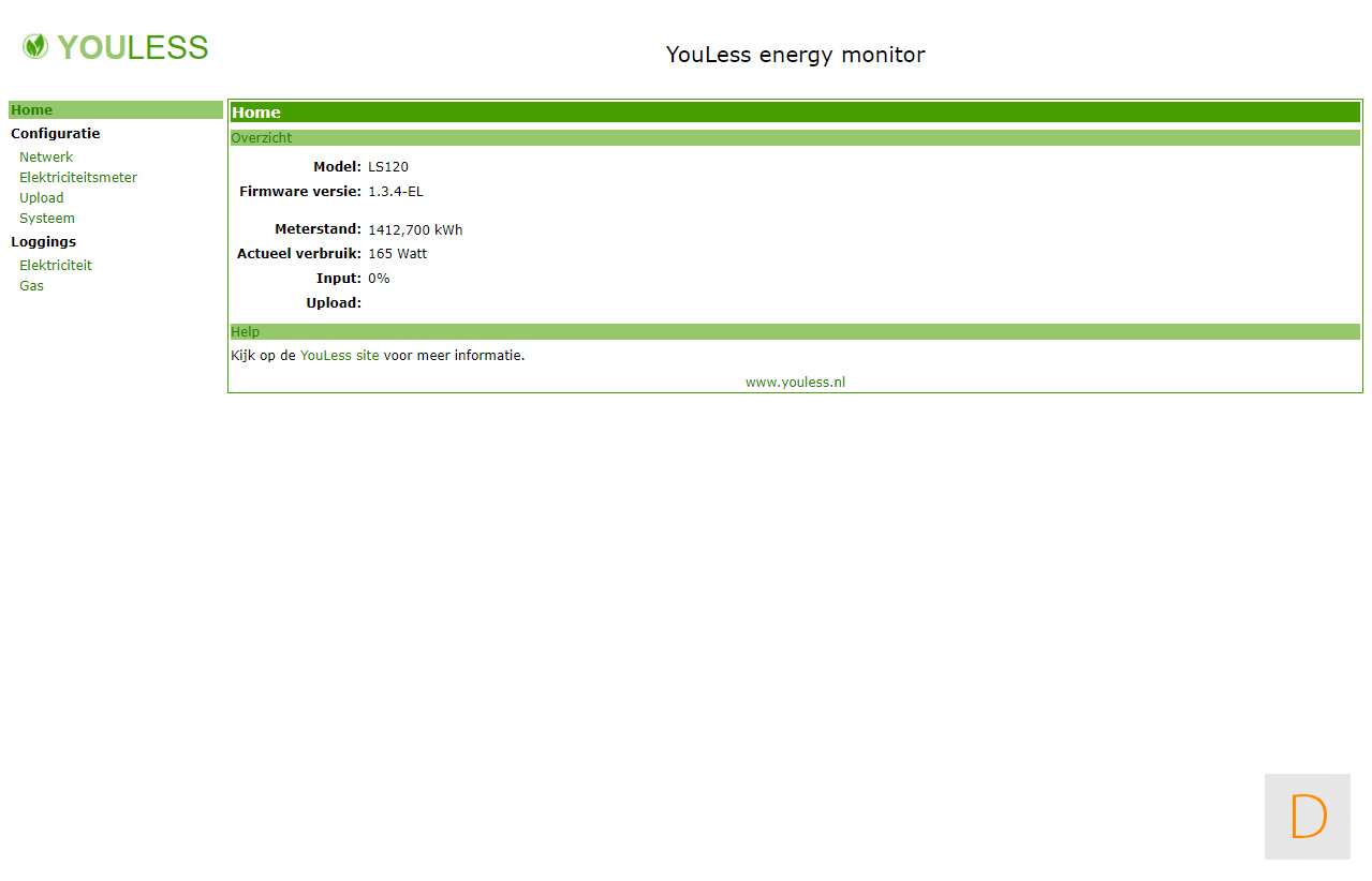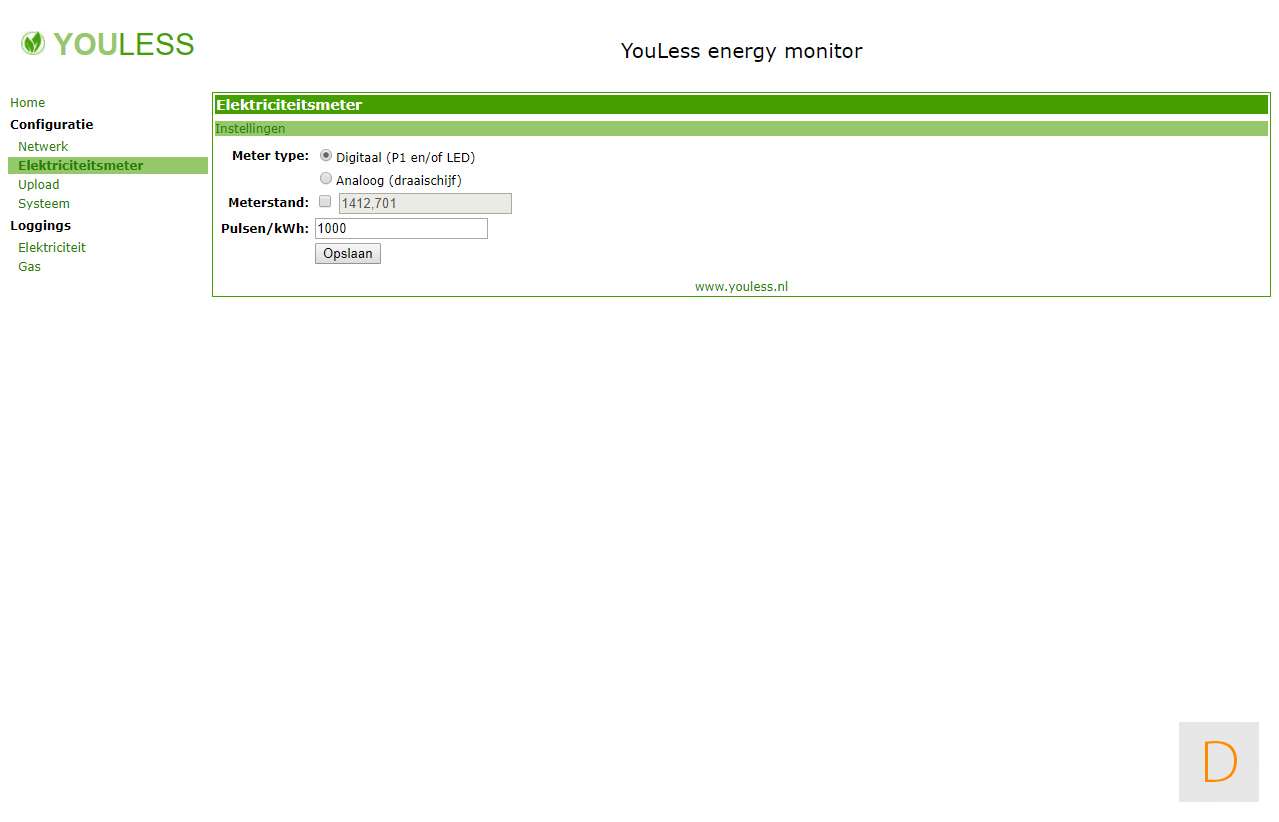 Om de configuratie te voltooien ga je via je browser naar http://youless (of je zoekt het IP-adress op). Vervolgens stel je het type elektriciteitsmeter in. Dit is in ons geval P1 (digitaal). Om te controleren of alles goed werkt kun je bij je Youless kijken of de groene LED knippert. Afhankelijk van je actuele verbruik kan dit even duren.