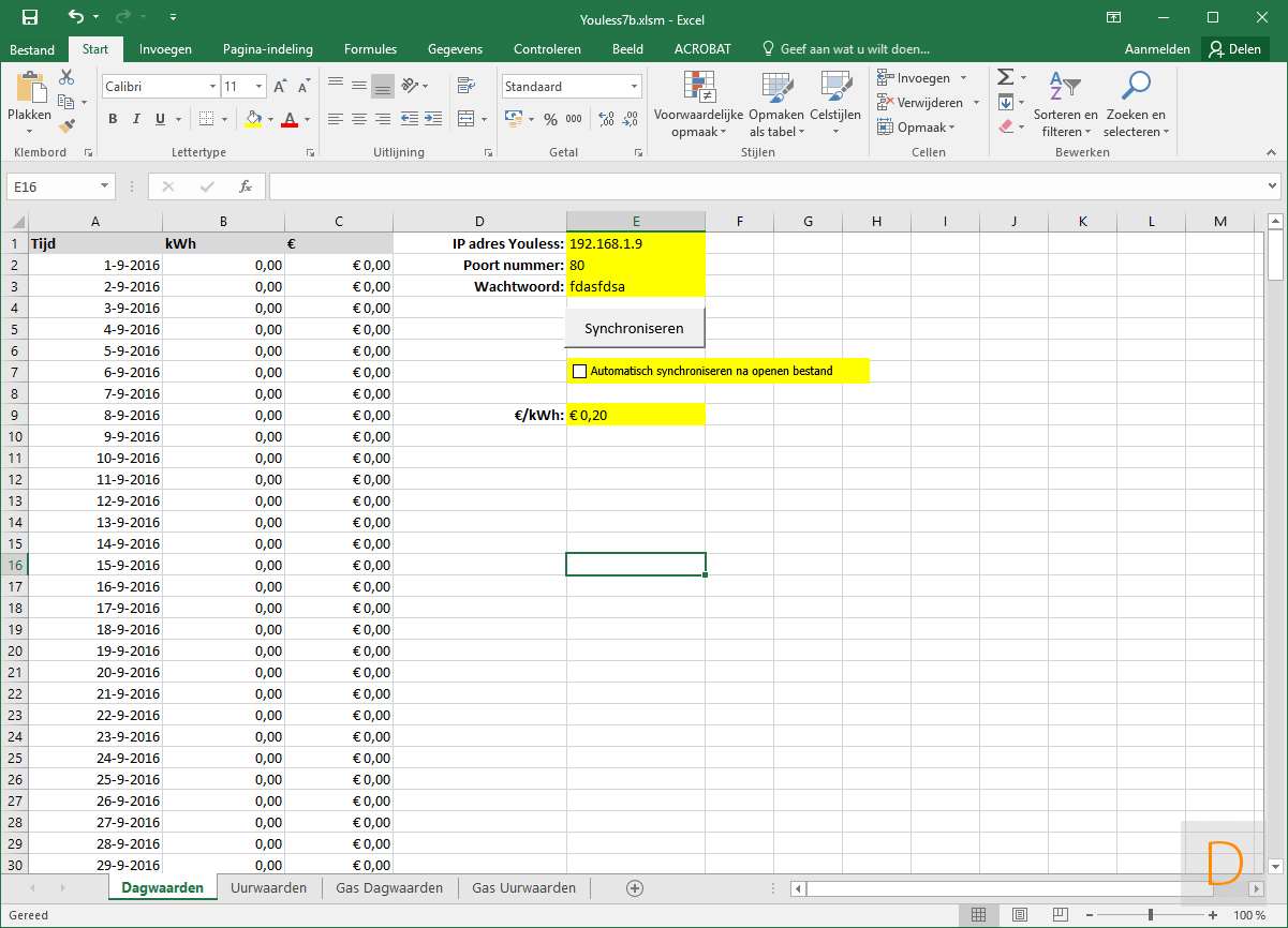 Als je nou geen domoticaysteem hebt of gebruik wilt maken van een online energiemanager heeft Youless een Excelsheet gemaakt waarbij je de data kunt ophalen. Als je handig bent met excel kun je natuurlijk hier mooie grafieken in maken en berekeningen. Leuk dat die optie aanwezig is.