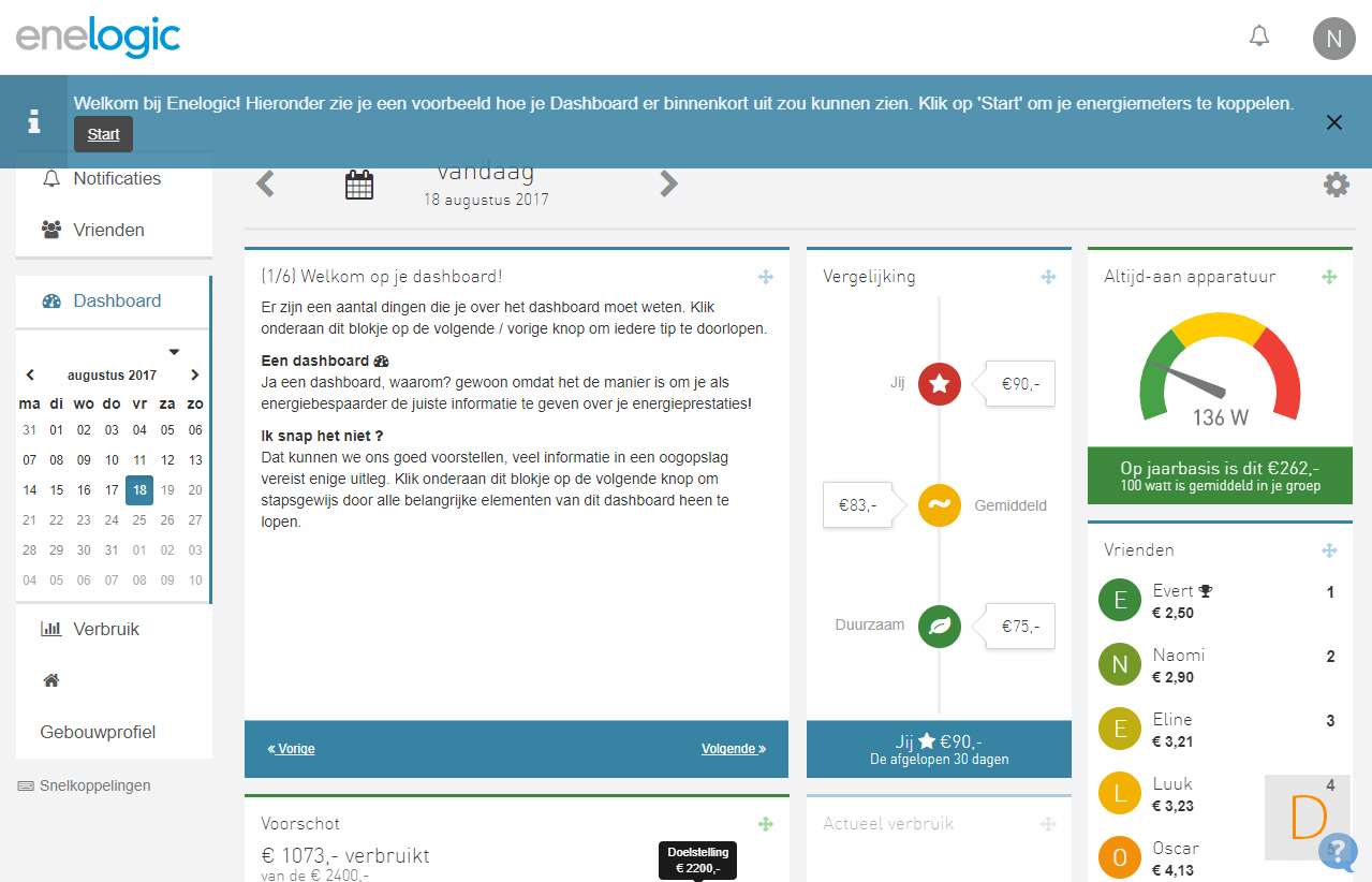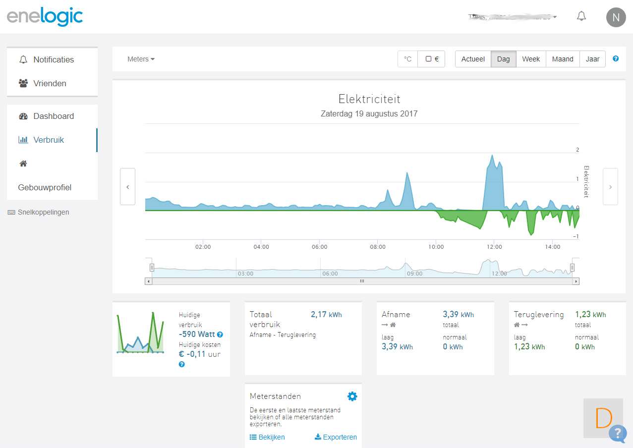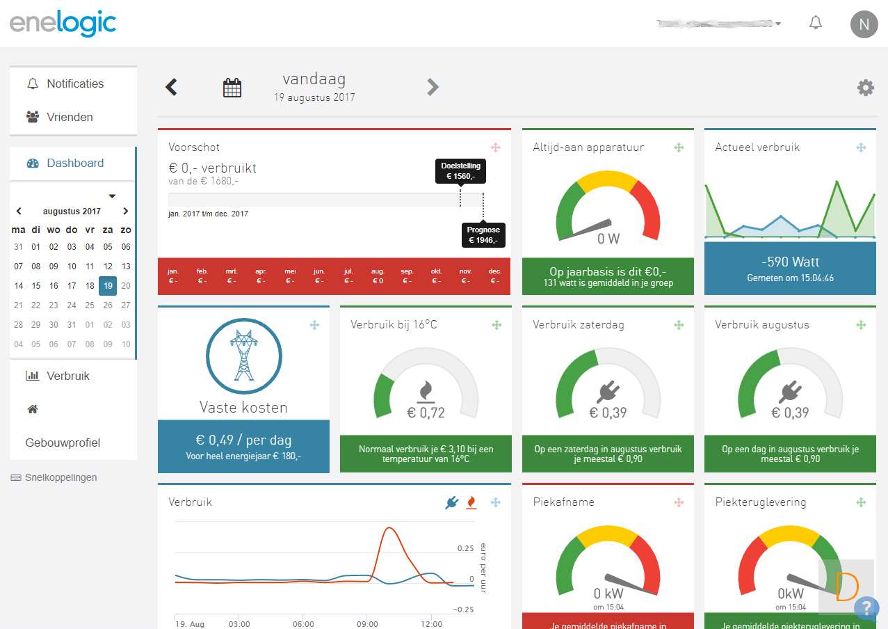 Als de installatie gelukt is en je bent weer ingelogd dan krijg je een dashboard te zien. Deze kun je zelf indelen en zaken aan- of uitzetten. Je ziet onder andere: Actueel (Live) verbruik, hoe je tov je voorschot zit, je verbruik per dag, je verbruik van de huidige maand en nog veel meer.