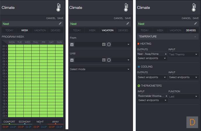 De ZipaTile heeft een standaard ingebouwde klimaatpaneel. Hiermee kun je gemakkelijk je verwarming bedienen. Ik maak zelf geen gebruik van deze widget maar je kunt hier je cv ketel/radiatoren aankoppelen en je temperatuur regelen.