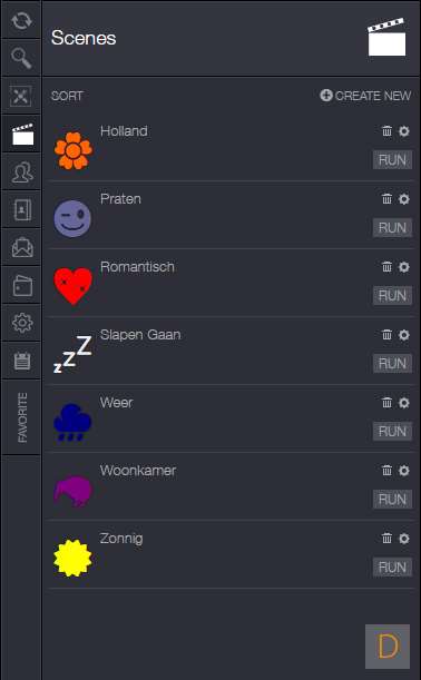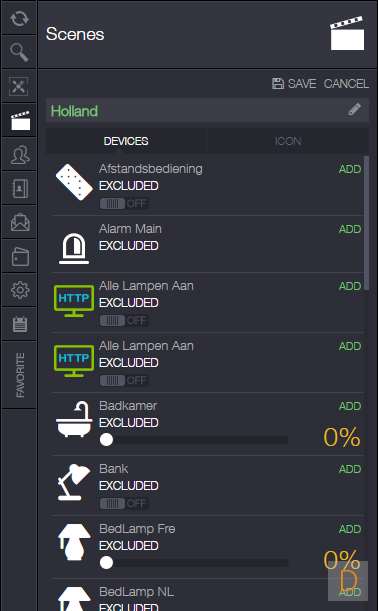 Met een scene kun je gemakkelijk een lamp aan- of uitzetten. Je kunt ook virtuele modules bedienen. De scences hebben een gemakkelijke opzet, je kunt hier dus geen ingewikkelde schakelingen mee regelen. Hiervoor is de rule creator (later meer hierover).
