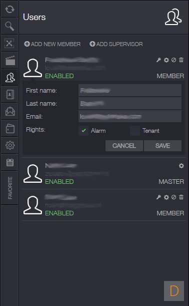 In dit gedeelte kun je gebruikers beheren. Er zijn kunnen 2 soorten rechten worden toegekend: Alarm en Tenant. De alarm rol mag het alarm aan/uitzetten en beheren, de Tenant rol heeft beperkte toegang tot het dashboard. Het rechten gedeelte is dus niet heel uitgebreid.