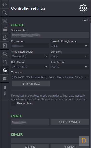 Bij de controller instellingen vind je de algemene gegevens. Hier vind je ook de mogelijkheid om de box te herstarten en om te upgraden naar een nieuwe firmware (ook de Beta).