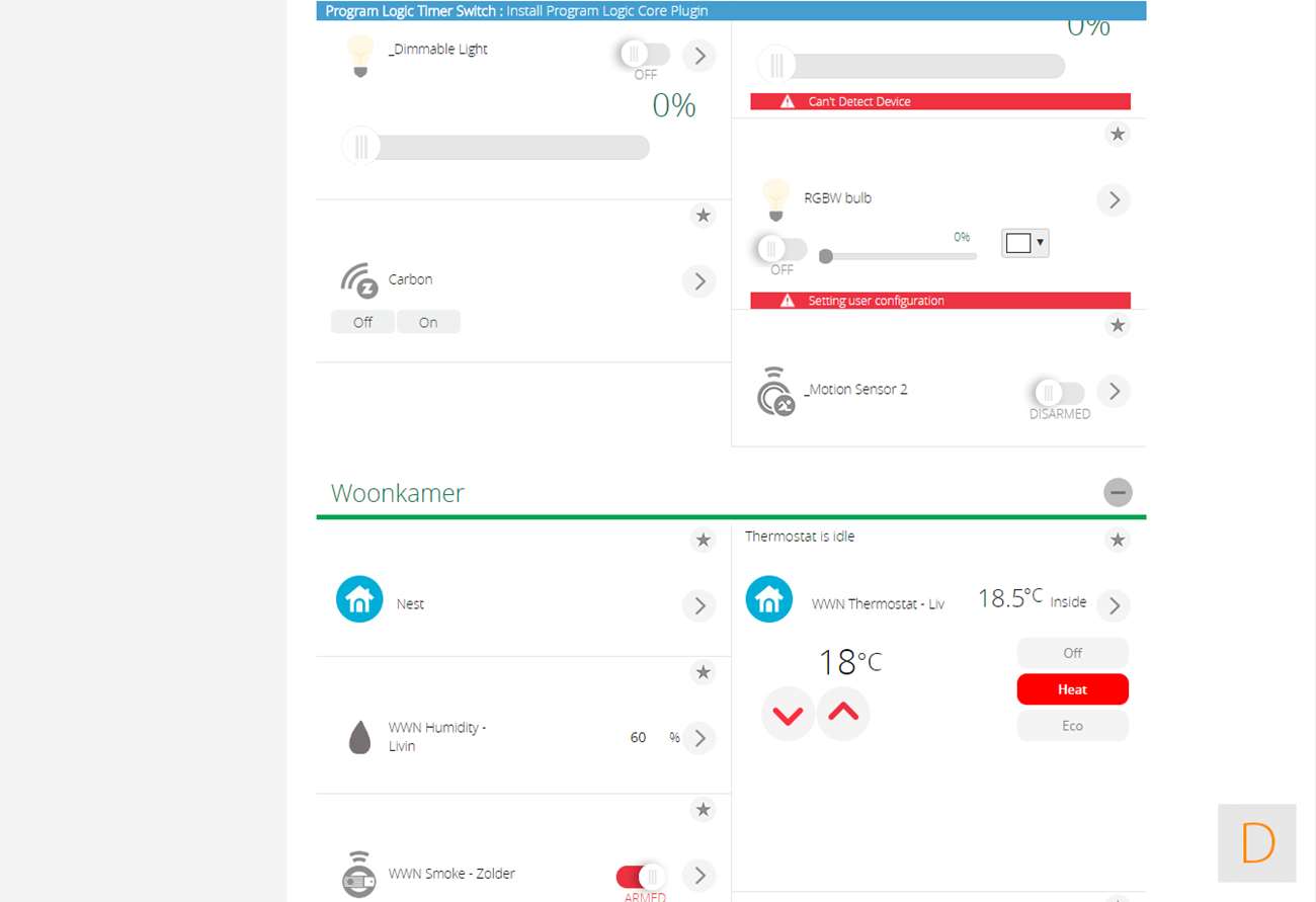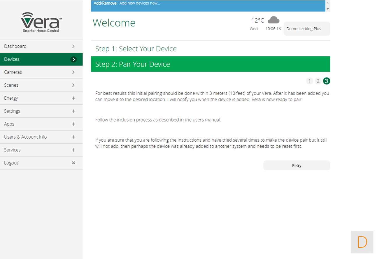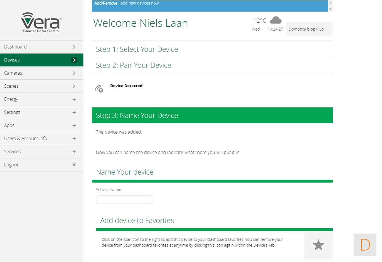 Het toevoegen van deze sensor gaat door in te loggen en naar het "devices" gedeelte te gaan. Vervolgens klik je op "add device" en zoek je hem op. Helaas werd hij niet gevonden dus heb het toevoegen als '"generic z-wave device" geprobeerd. Hierna is het kwestie van hierop klikken en zal het aftellen beginnen. Vervolgens verwijder je het lipje bij de batterij en steekt het pinnetje in het gaatje aan de zijkant. Je kunt het toevoegen starten door het pinnetje 3x naar binnen te duwen. Hij werd hierna netjes gevonden en toegevoegd en zie hem verschijnen op het dashboard.