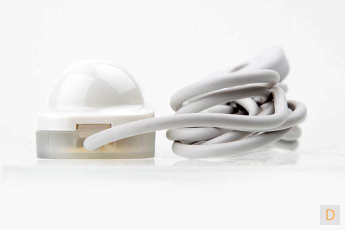 Handig van deze sensor is dat er een draad aan zit waar de "probe" aan bevestig zit. Je kunt de sensor dus wat hoger hangen of je "probe" precies plaatsen waar hij nodig is. Het vastmaken van de sensor kan door de bijgeleverde schroeven of dubbelzijdig tape.