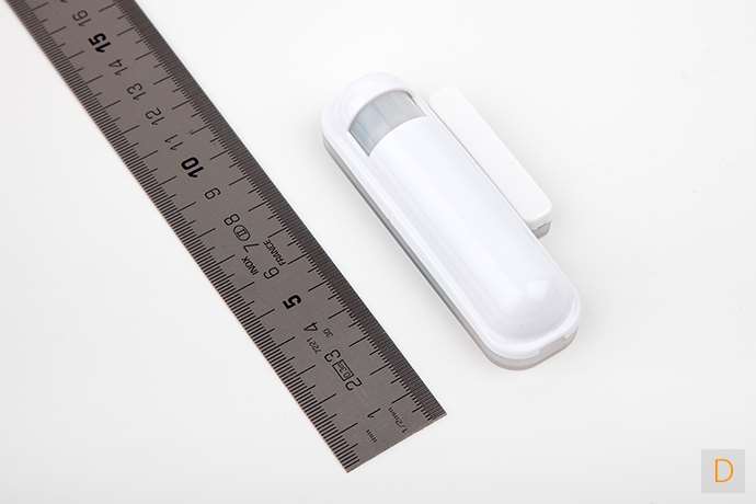 De Multisensor Quad bestaat uit 2 delen. Een deel is de magneet welke 50x10x12,5mm (HXBXD) groot is. Het 2de deel (de sensor) is ook niet al te groot: 96x28x28mm (HxBxD). Hij wordt gevoed door een CR123A batterij, dit is dezelfde als gebruikt wordt in de Fibaro Rookmelder.