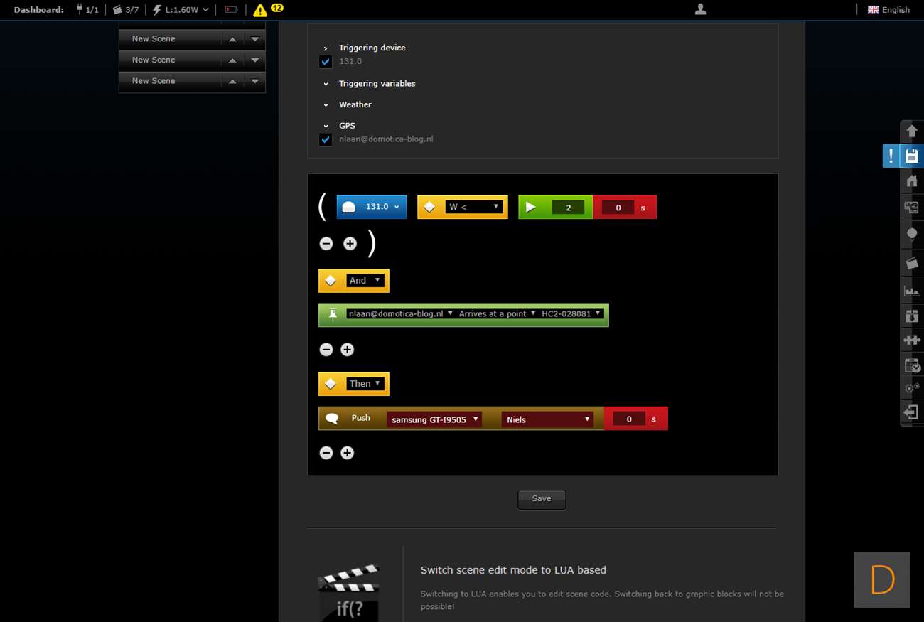 Ik wil graag een seintje op mijn mobiel als ik thuis ben, en mijn wasmachine klaar is met de was. Als eerste heb ik uitgezocht wat het standby (was is klaar) verbruik is en het verbruik als de wasmachine nog draait. Bij was dit 2,2 en 1000 W en hoger. Het viel mij ook op dat de machine af en toe ook naar 0 gaat en dan weer verder. Om geen valse melding te krijgen heb ik een extra check in gebouwd.