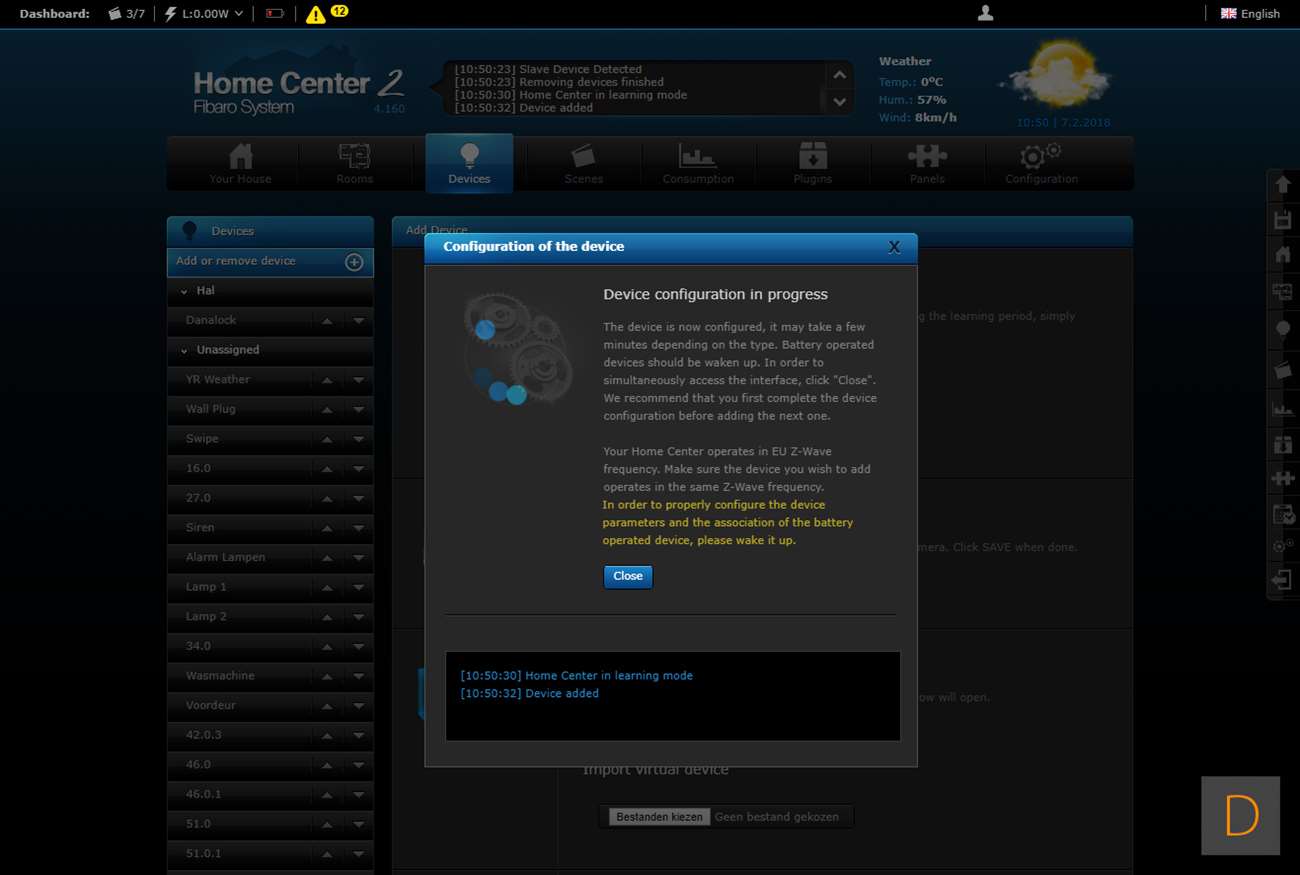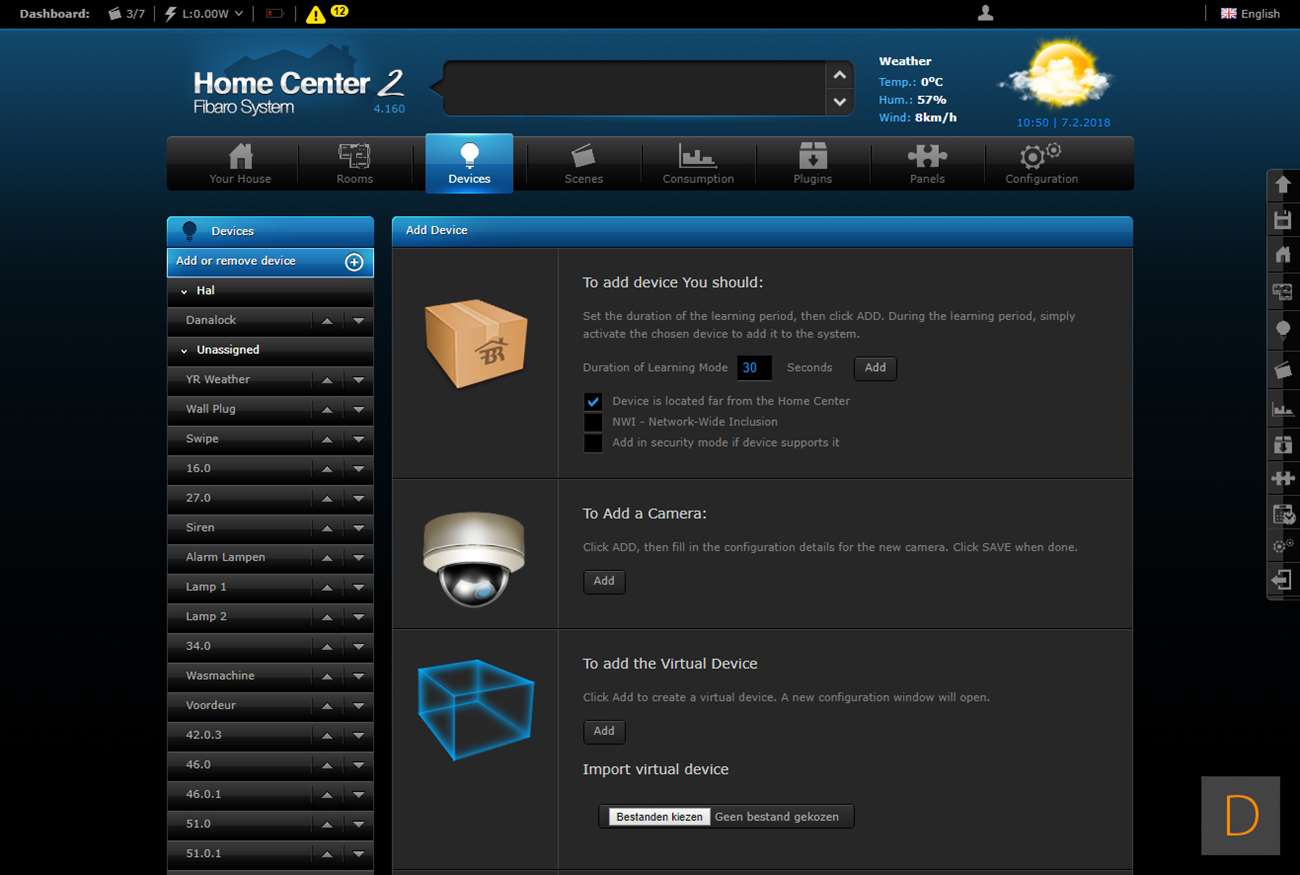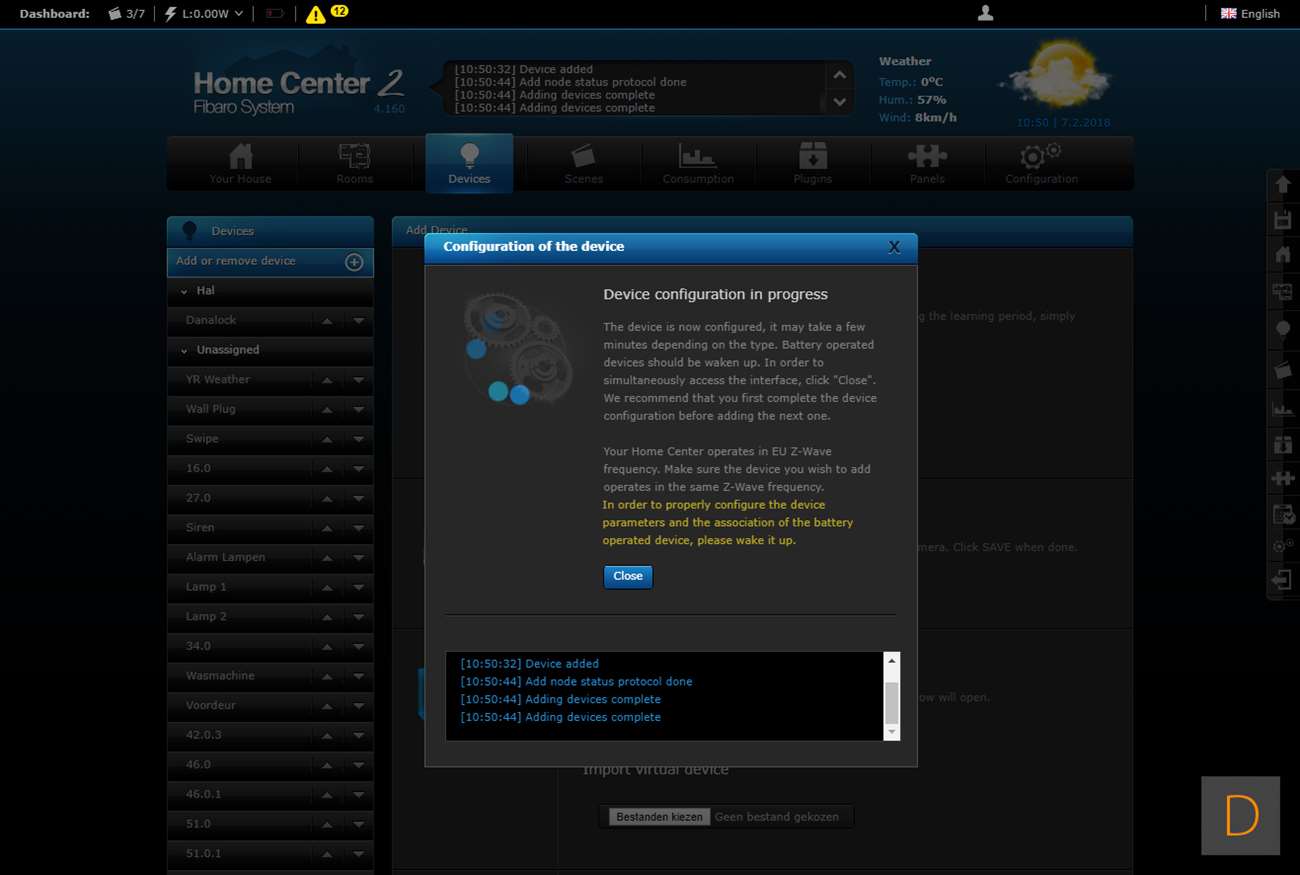 Het toevoegen van pluggen aan de HC2 geven over het algemeen weinig problemen. We gaan zien of dat ook bij deze zo is. Je kunt deze plug toevoegen door in te loggen op de hc2 en naar het device gedeelte te gaan. Vervolgens klik op "add or remove device" en hierna op ADD. Toevoegen zal starten als je de plug van stroom voorziet. De plug zal blauw gaan knipperen om aan te geven dat het toevoegen is gestart. De plug werd netjes gevonden en toevoegt bij mijn apparaten. Ik zie een aan- en uit schakelaar, het totaalverbruik, huidige verbruik en Voltage.