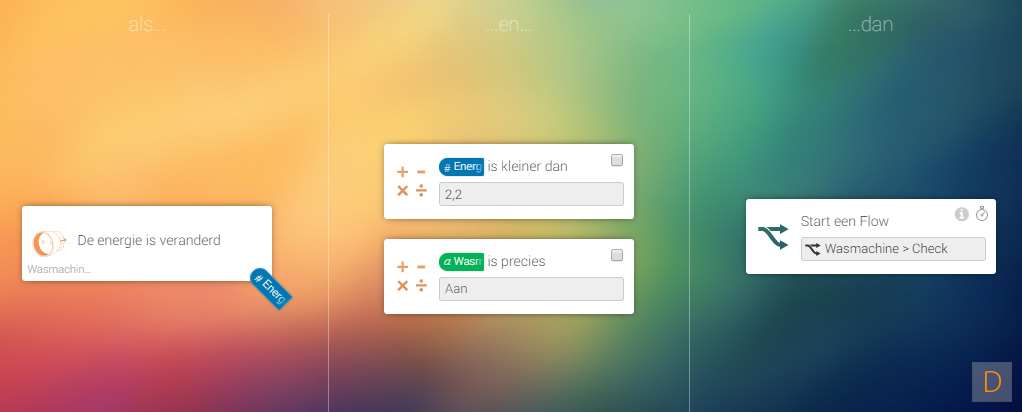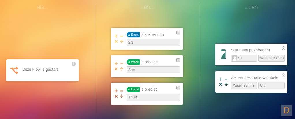Ik wil graag een seintje op mijn mobiel als mijn wasmachine klaar is met de was. Als eerste heb ik uitgezocht wat het standby (was is klaar) verbruik is en het verbruik als de wasmachine draait. Bij mij was dit 2,2 en 1000 W en hoger. Het viel mij ook op dat de machine af en toe ook naar 0 gaat en dan weer verder. Om geen valse melding te krijgen heb ik een extra check in gebouwd. Als extraatje kijk ik ook nog of ik thuis ben en stuur ik alleen een notificatie als ik er ben.
