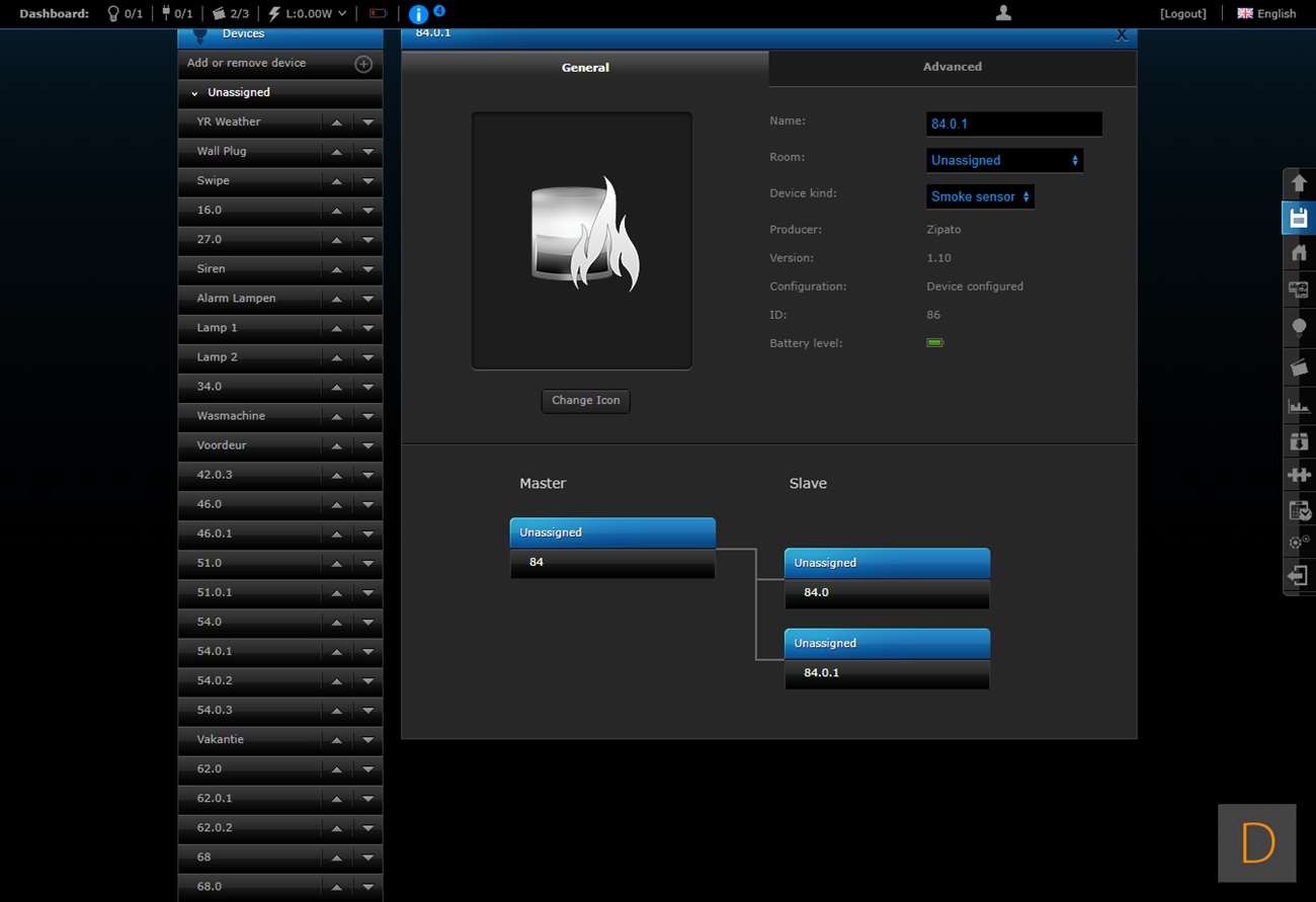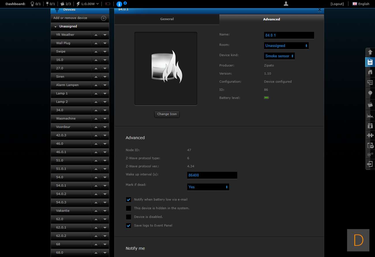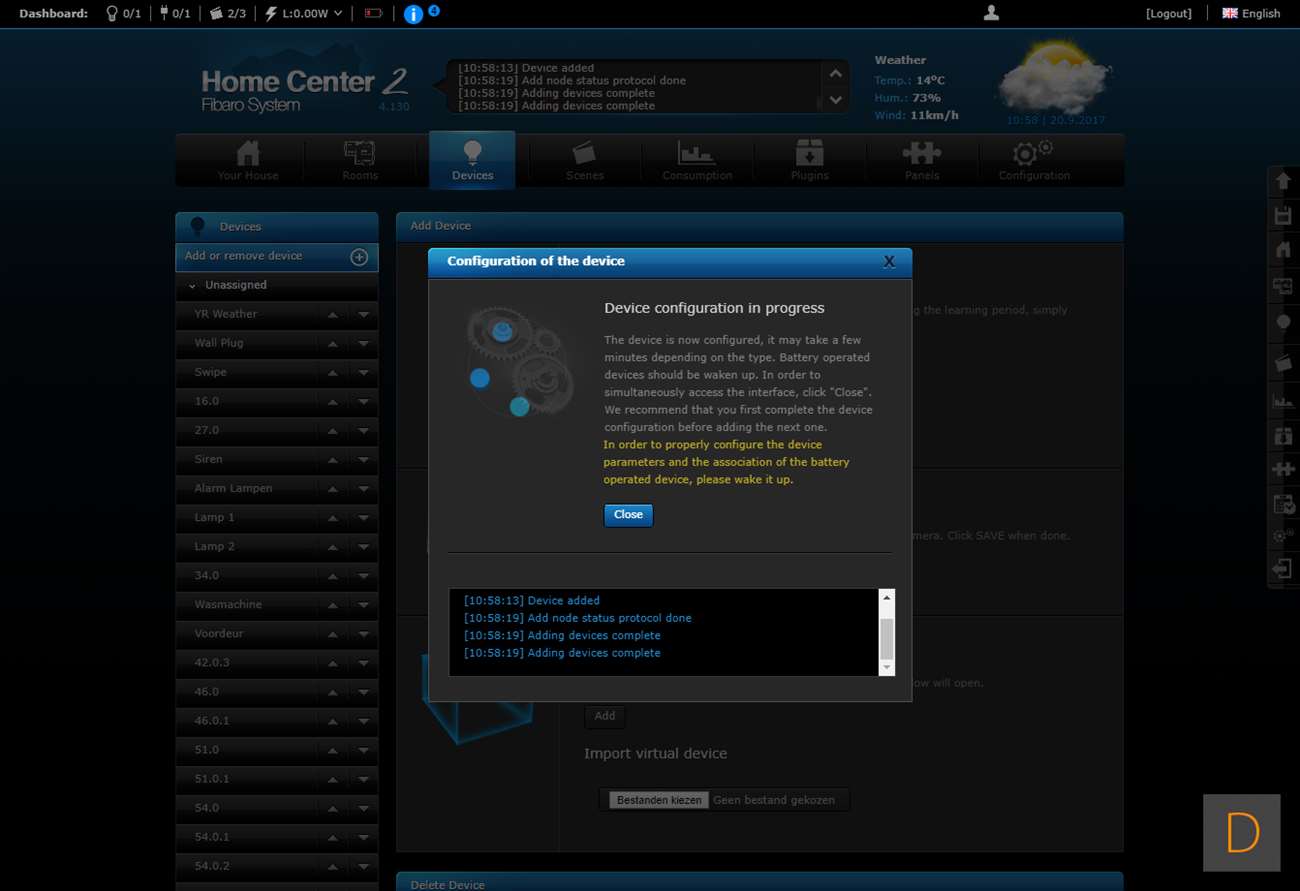 In deze rookmelder zitten geen extra sensoren en mogelijkheden, dus het toevoegen aan de HC2 zou geen problemen moeten geven. Het toevoegen van deze rookmelder gaat door in te loggen en naar het "devices" gedeelte te gaan. Vervolgens klik je op "add or remove device" en hierna op "add". Het toevoegen zal dan gaan starten. Hierna moet je het lipje bij de batterij verwijderen en het pinnetje drie keer achter elkaar in het gaatje duwen. Hij werd netjes gevonden en toegevoegd aan het dashboard en zie een rookmelding binnen komen.