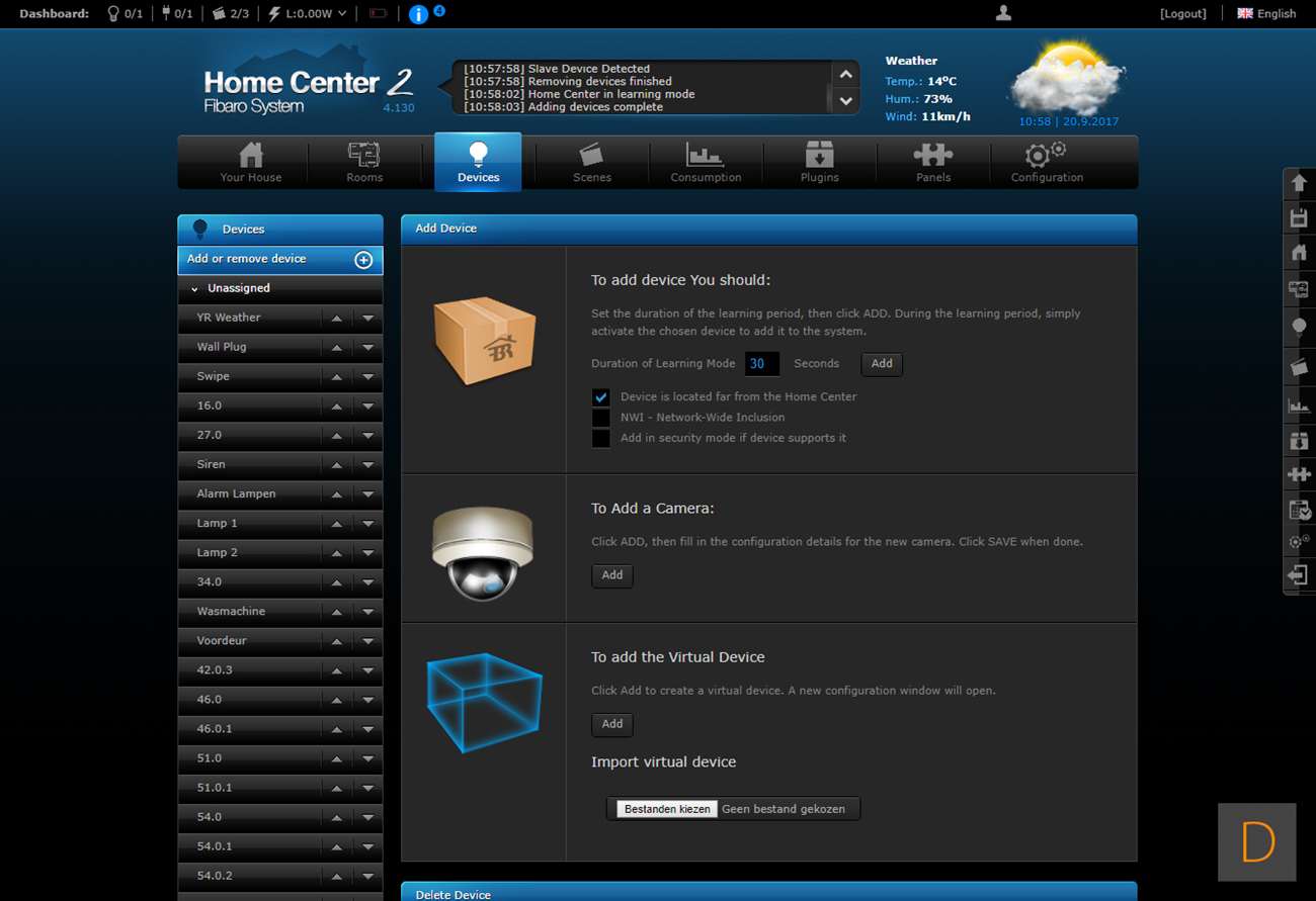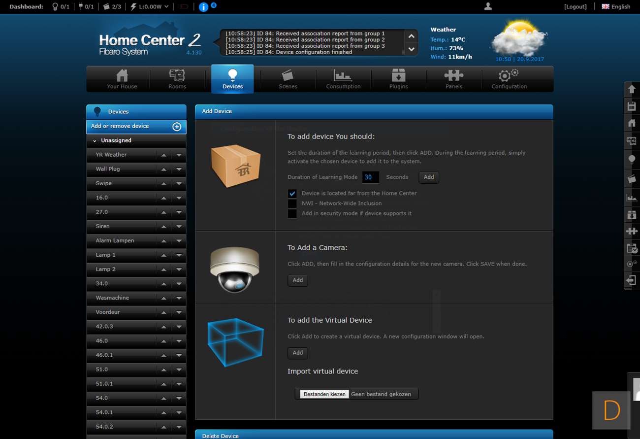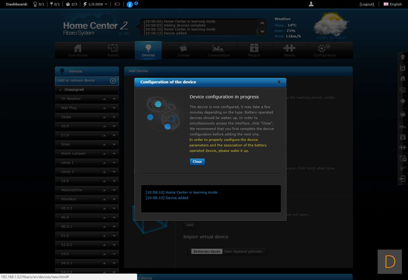In deze rookmelder zitten geen extra sensoren en mogelijkheden, dus het toevoegen aan de HC2 zou geen problemen moeten geven. Het toevoegen van deze rookmelder gaat door in te loggen en naar het "devices" gedeelte te gaan. Vervolgens klik je op "add or remove device" en hierna op "add". Het toevoegen zal dan gaan starten. Hierna moet je het lipje bij de batterij verwijderen en het pinnetje drie keer achter elkaar in het gaatje duwen. Hij werd netjes gevonden en toegevoegd aan het dashboard en zie een rookmelding binnen komen.