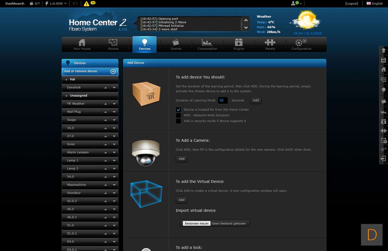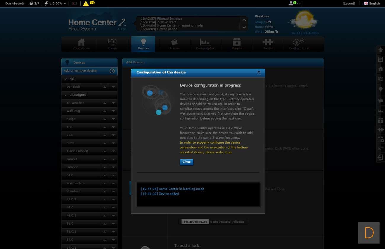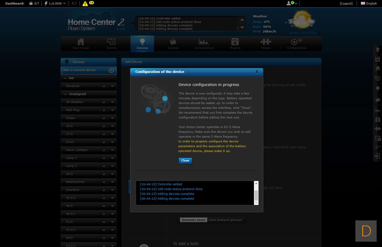 Het toevoegen van deze scene master gaat door in te loggen op de HC2 en naar het device gedeelte te gaan. Vervolgens klik je op "add new device" en hierna op add. De toevoegen procedure zal starten. Hierna is het zaak om het klepje aan de achterkant los te maken en de batterijen te plaatsen. Vervolgens klikje op het "L" knopje om het toevoegen te starten. Deze zal gaan knipperen en als hij gevonden word zal deze 4 sec lang oplichten om hierna weer te gaan knipperen. Hij werd netjes gevonden door de HC2 en zie hem verschijnen op de apparaten. Bij de configuratie kan ik instellen welke knop wat doet.