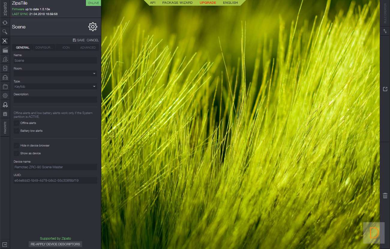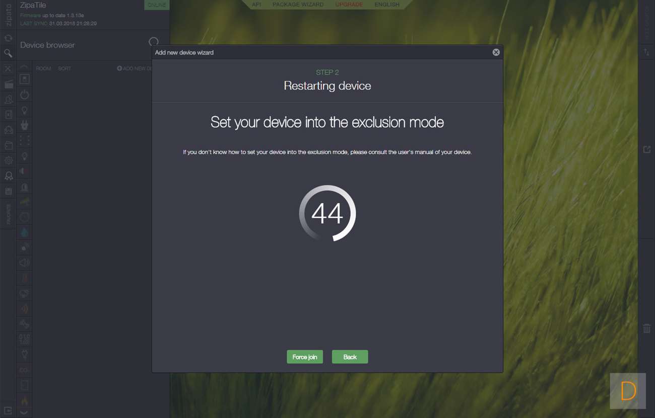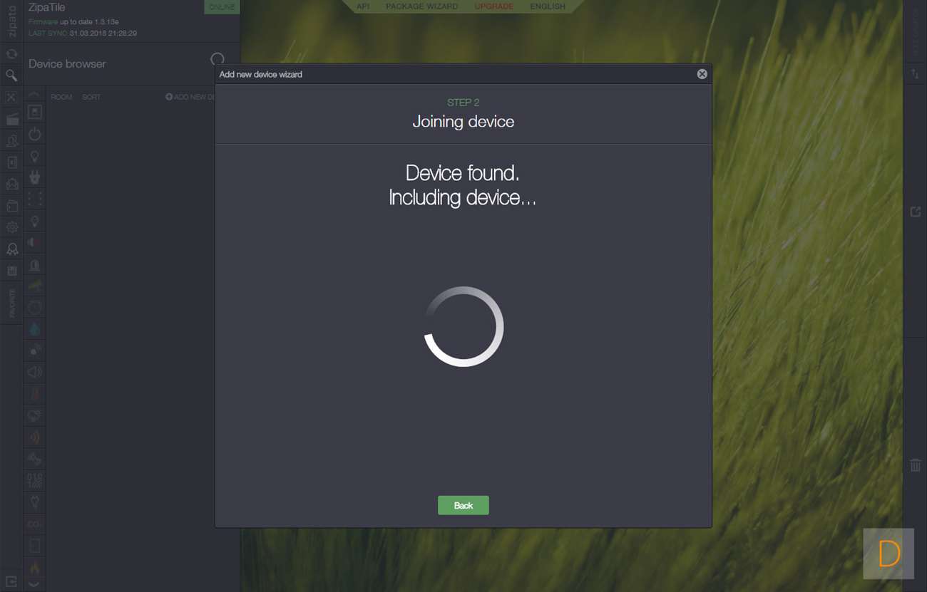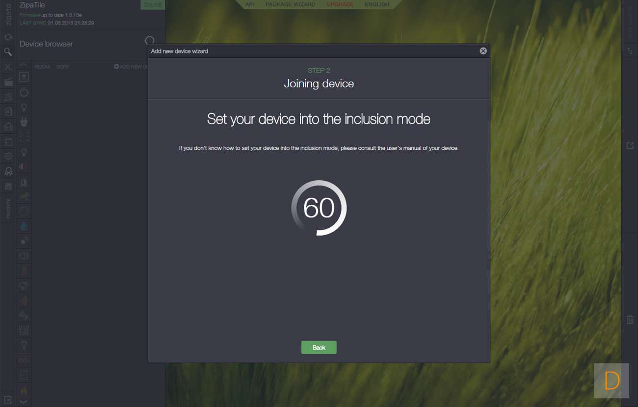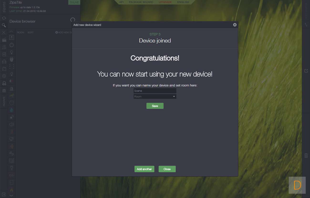 Het toevoegen aan de ZipaTile kun je starten door in te loggen op de controller en naar het device te gaan. Vervolgens klik je op "add device" en klik je op Z-Wave. Het toevoegen zal starten. Bij de ZipaTile reset/verwijder je eerst altijd een nieuwe apparaat. Je kunt dit starten door het klepje aan de achterkant van de scene master te verwijderen en de batterijen te plaatsen. Hierna moet je op de "L" knop drukken. De LED zal gaan knipperen en hierna 4 sec lang branden. Als het toevoegen is gelukt zal hij nogmaals gaan knipperen. Deze procedure herhaal je nog een keertje.