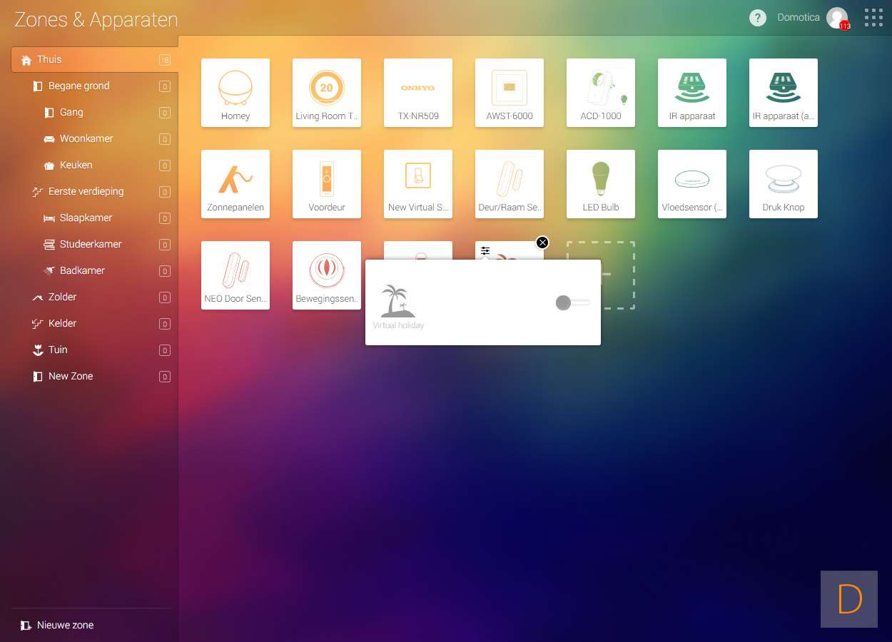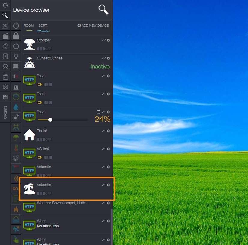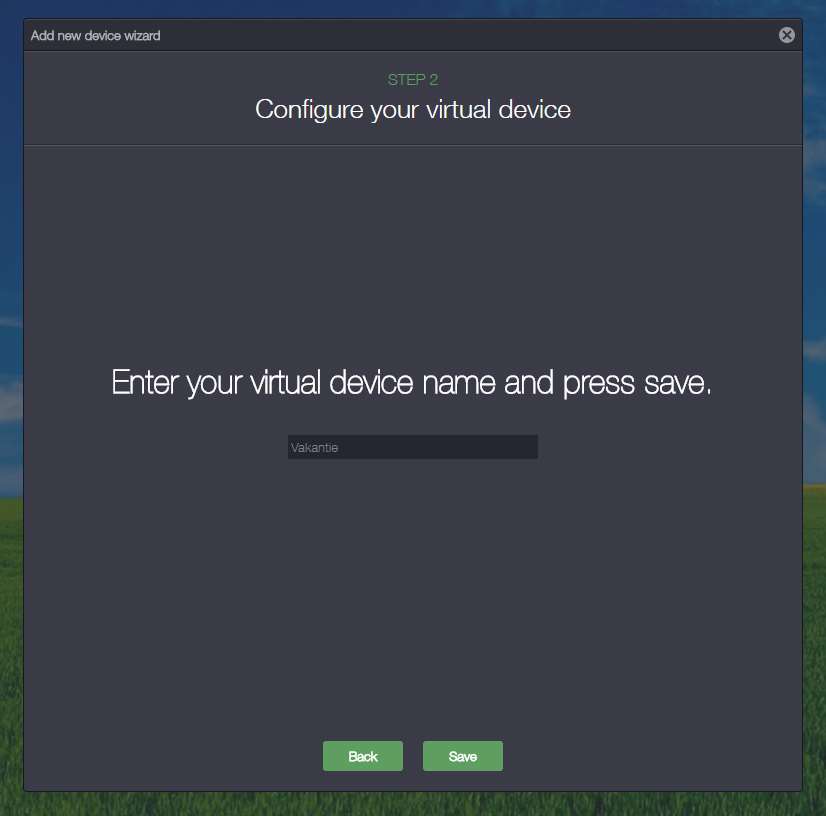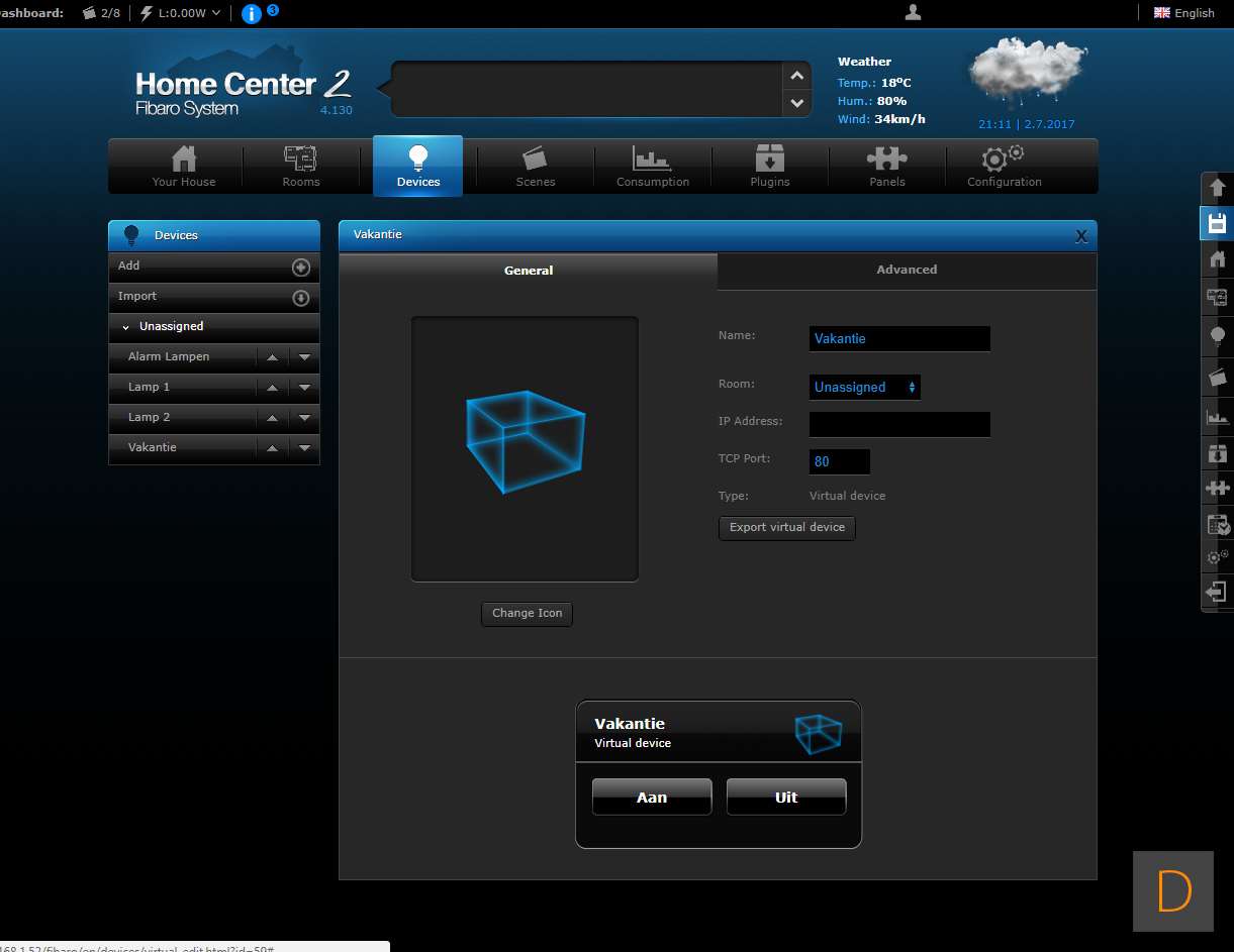 Als eerste maak ik een "virtual device". Deze noem ik vakantie. Hierbij is AAN=weg en UIT=Thuis. Deze zorgt dat een variabele ingesteld wordt zodat ik deze als voorwaarden kan gebruiken in een regel.