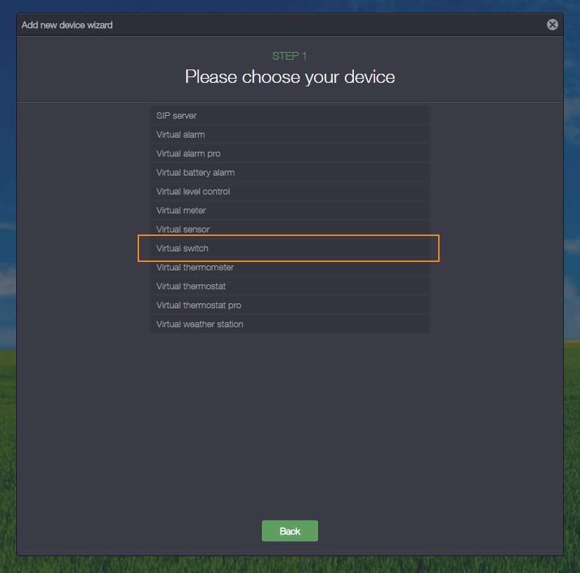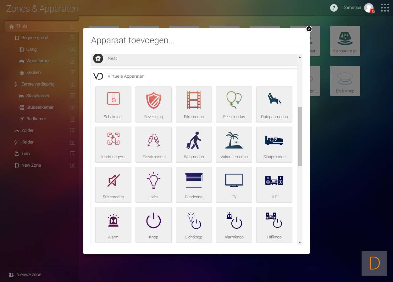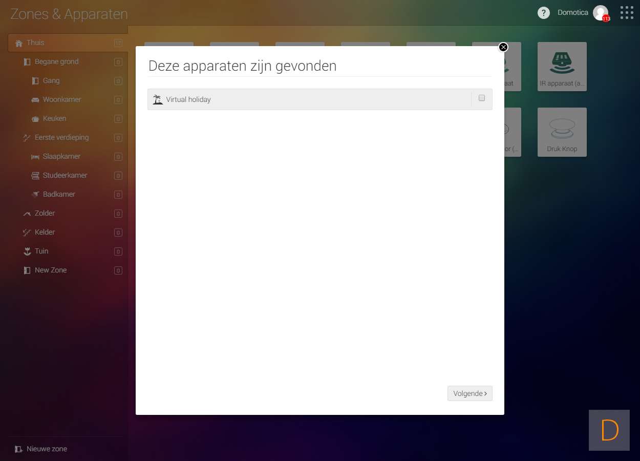 Als eerste maak ik een "virtual device". Deze noem ik vakantie. Hierbij is AAN=weg en UIT=Thuis. Deze zorgt dat een variabele ingesteld wordt zodat ik deze als voorwaarden kan gebruiken in een regel.