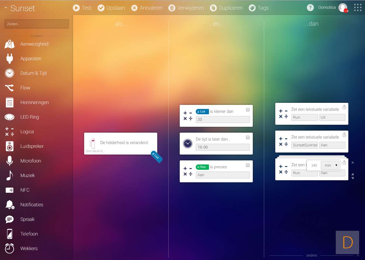 Ik wil graag dat alleen de lampen uit/aan gaan als het donker in huis is. Anders is het tenslotte zonde van de energie en we bereiken hier niks mee. Je kunt dit op verschillende manieren regelen. Je zou gebruik kunnen maken van de sunset/sunrise functie in de Homey. Wat ik zelf fijner vind werken is om gebruik te maken van een lux-meter. Deze hangt bij mij in de hal en meestal, als het daar donker is, dan is het in de rest van het huis ook tijd om een lamp aan te doen.