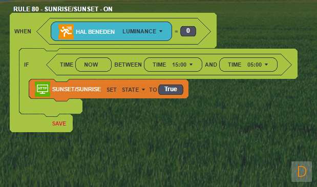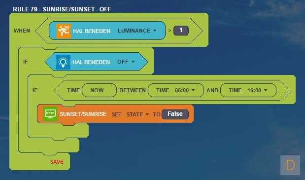 Omdat ik wil dat deze regel alleen draait als het donker genoeg is in huis maak ik een regel om hier voort te zorgen. Ik maak hierbij van mij bestaande Sunset/Sunrise regel. Deze kun je vinden bij ROBBshop: https://www.robbshop.nl/domotica/het-fibaro-systeem/fibaro-tips-en-tricks/dag-nacht-scene-maken-met-lua