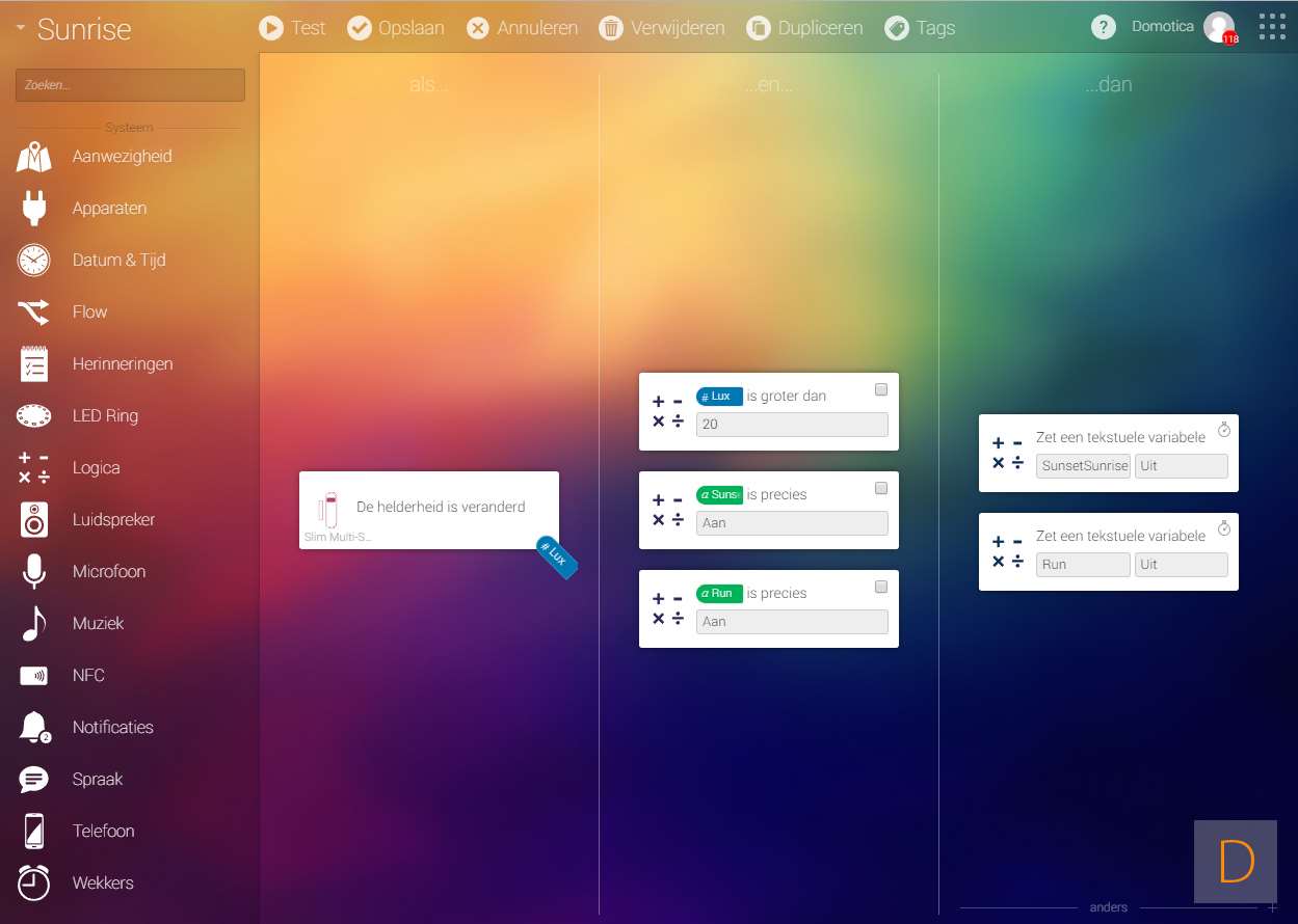 In de "ALS" kolom zet ik de lichtmeter als trigger. In de "EN" kolom de volgende 3 elementen waar de flow ook aan moet voldoen: