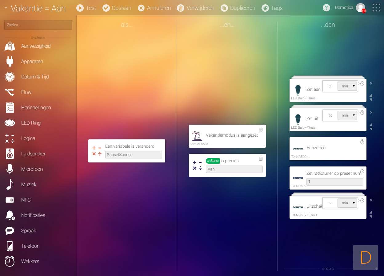 Bovenstaande is natuurlijk een voorbeeld, want je kunt natuurlijk nog veel meer lampen en apparaten toevoegen. Je zou ook nog 2 flows kunnen maken welke om de dag op een andere tijdstip starten. Zo simuleer je nog beter een echte situatie.