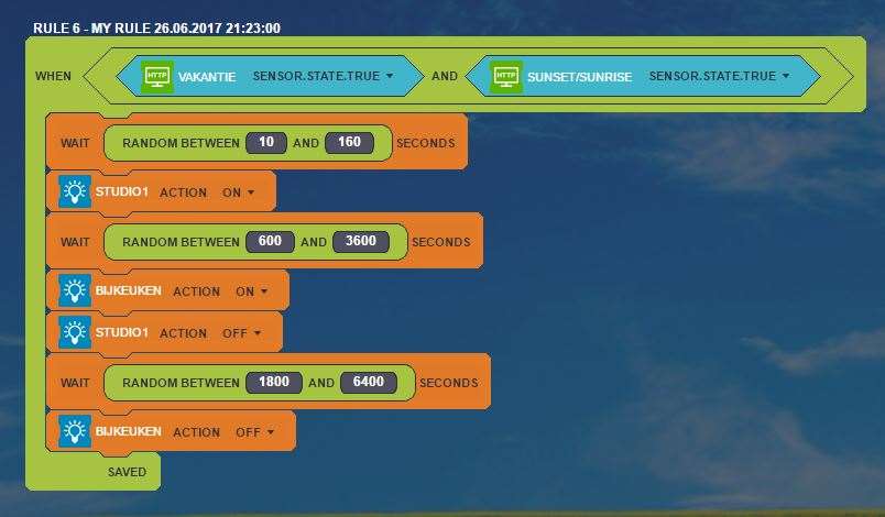 We gaan allemaal weer lekker op vakantie. We zorgen natuurlijk dat we onze ramen en deuren goed sluiten en ons alarm systeem aanzetten. Je domotica systeem hoeft niet met vakantie dus deze kunnen we aan het werk zetten om net te doen of we thuis zijn. Dit kun je gemakkelijk realiseren met een paar regels. Onderstaand laten wij bij de 3 grootste controllers zien hoe je dit voor elkaar kunt krijgen.